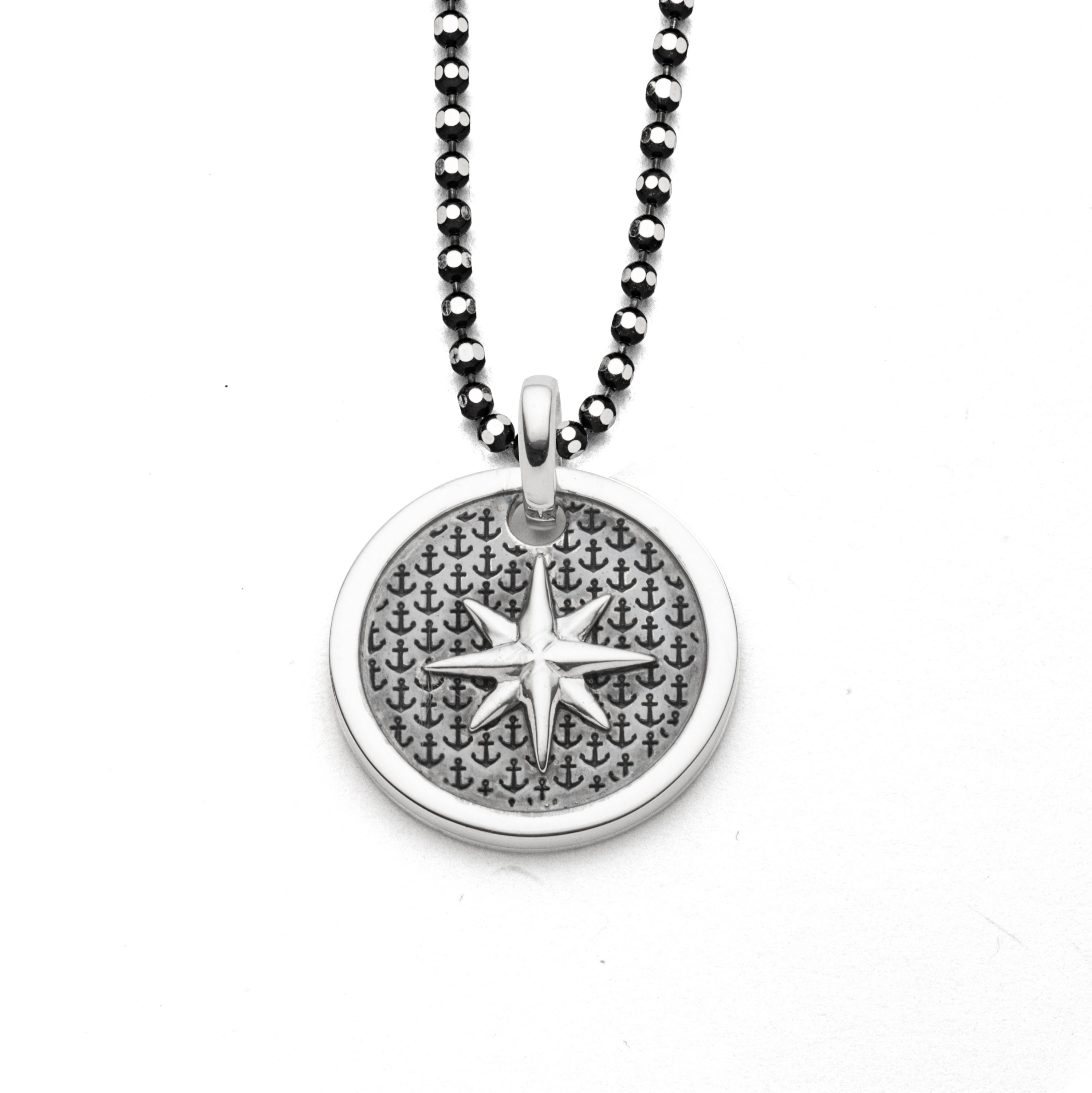 Runder, flacher Anhänger Ankerplatz "Kompass" mit dem silbernen Motiv: "Kompassrose" und gelaserten, schwarz oxidierten Anker-Icons im Hintergrund, aus 925er Sterling-Silber.