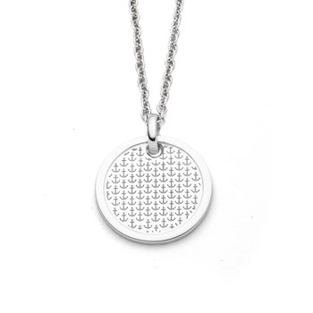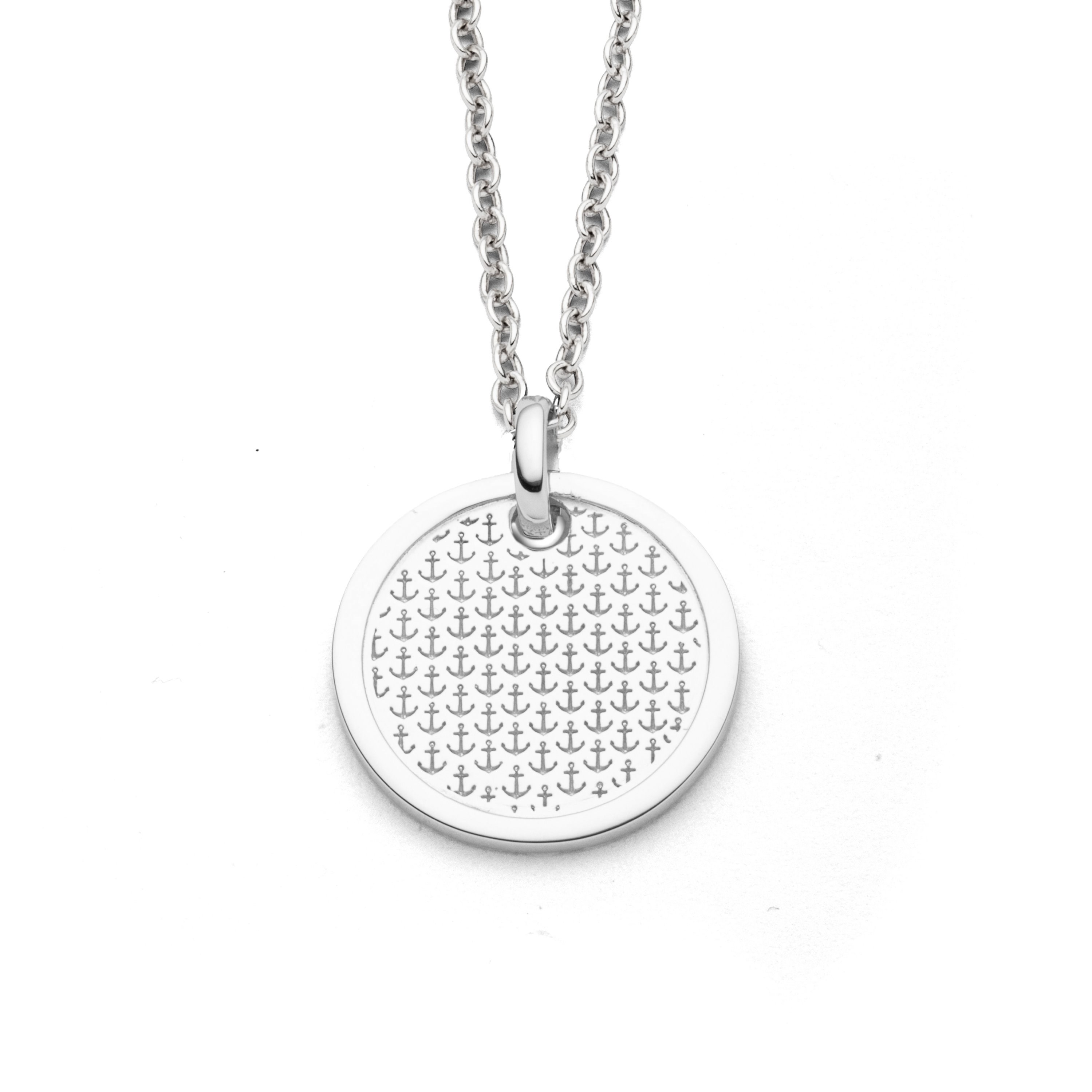 Runder, flacher Anhänger "Ankerplatz" mit gelaserten, Anker-Icons im Hintergrund, aus rhodiniertem 925er Sterling-Silber.