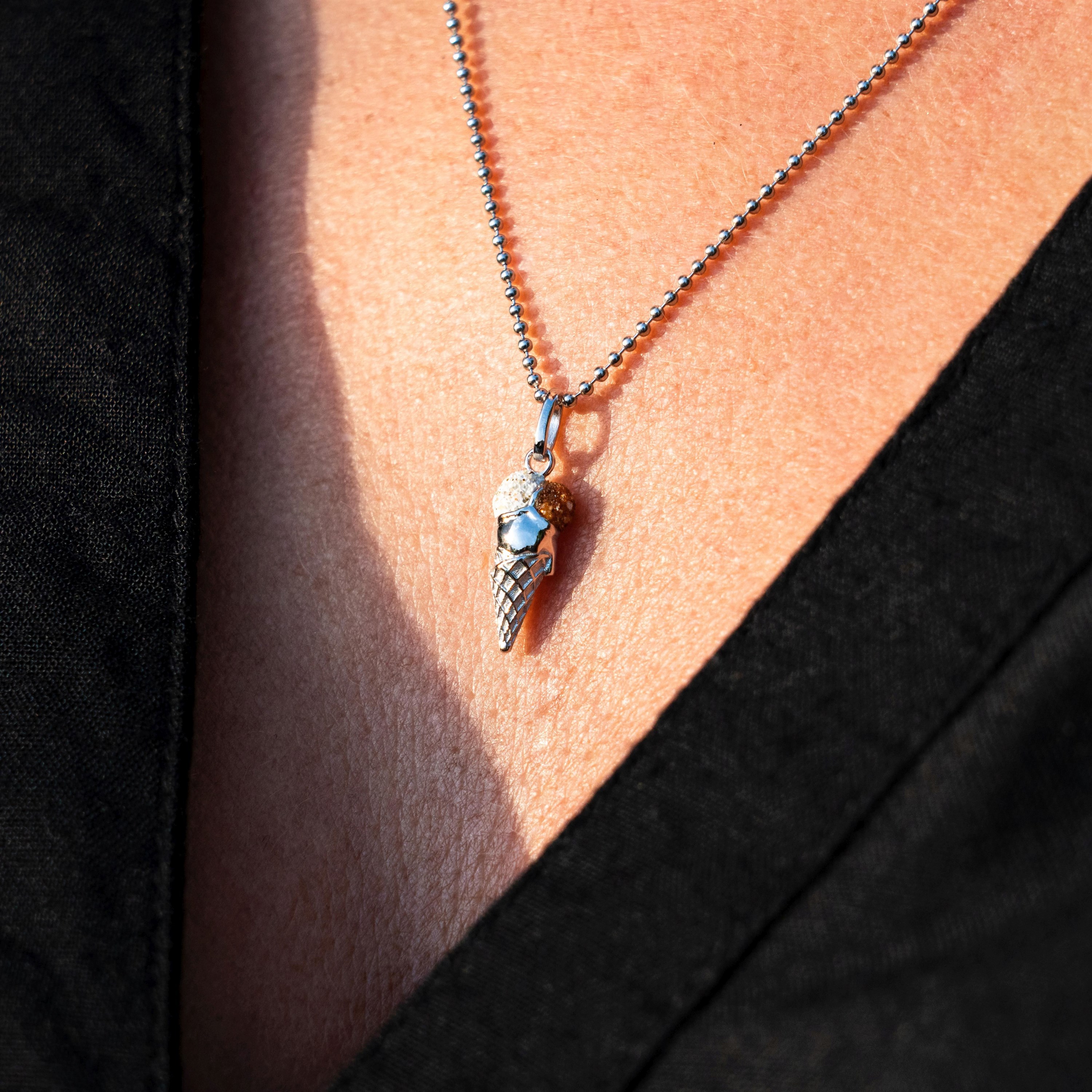 Echte Sehnsucht: Anhänger in Form einer Eistüte, teilweise gefüllt mit Strandsand und Bernsteinsand, alles aus poliertem und rhodiniertem 925er Sterling-Silber