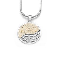 Runder Anhänger "Fischschwarm" mit einer Welle, der obere Teil ist mit Strandsand gefüllt, der untere besetzt mit einem silbernen Fischschwarm innen sandgestrahlt, alles gefasst in poliertem, rhodiniertem 925er Sterling-Silber.