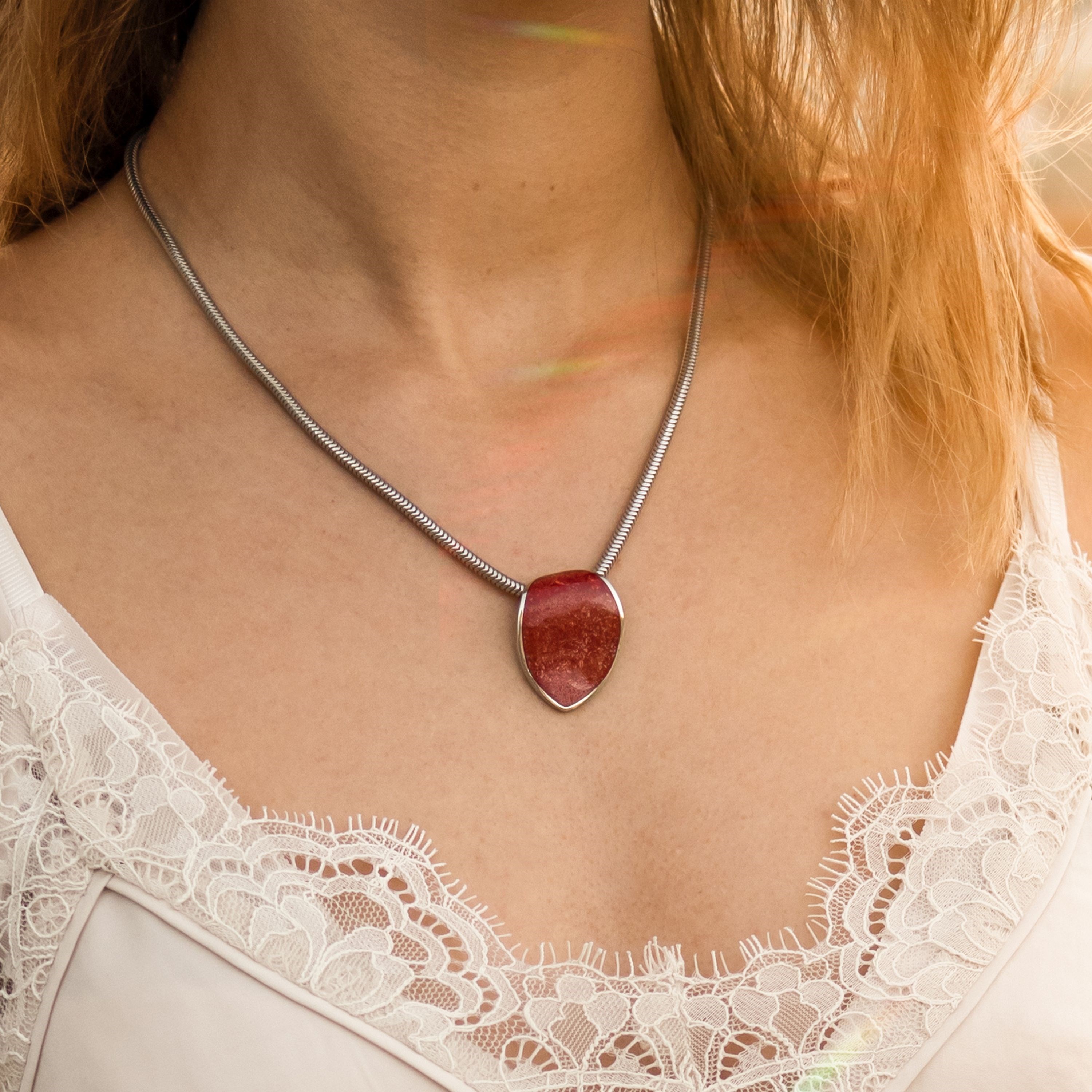 Geschwungener, handgefertigter Anhänger in Form einer Insel, gefüllt mit Korallensand und auf der Rückseite angebrachter Öse, gefasst in rhodiniertem 925er Sterling-Silber.
