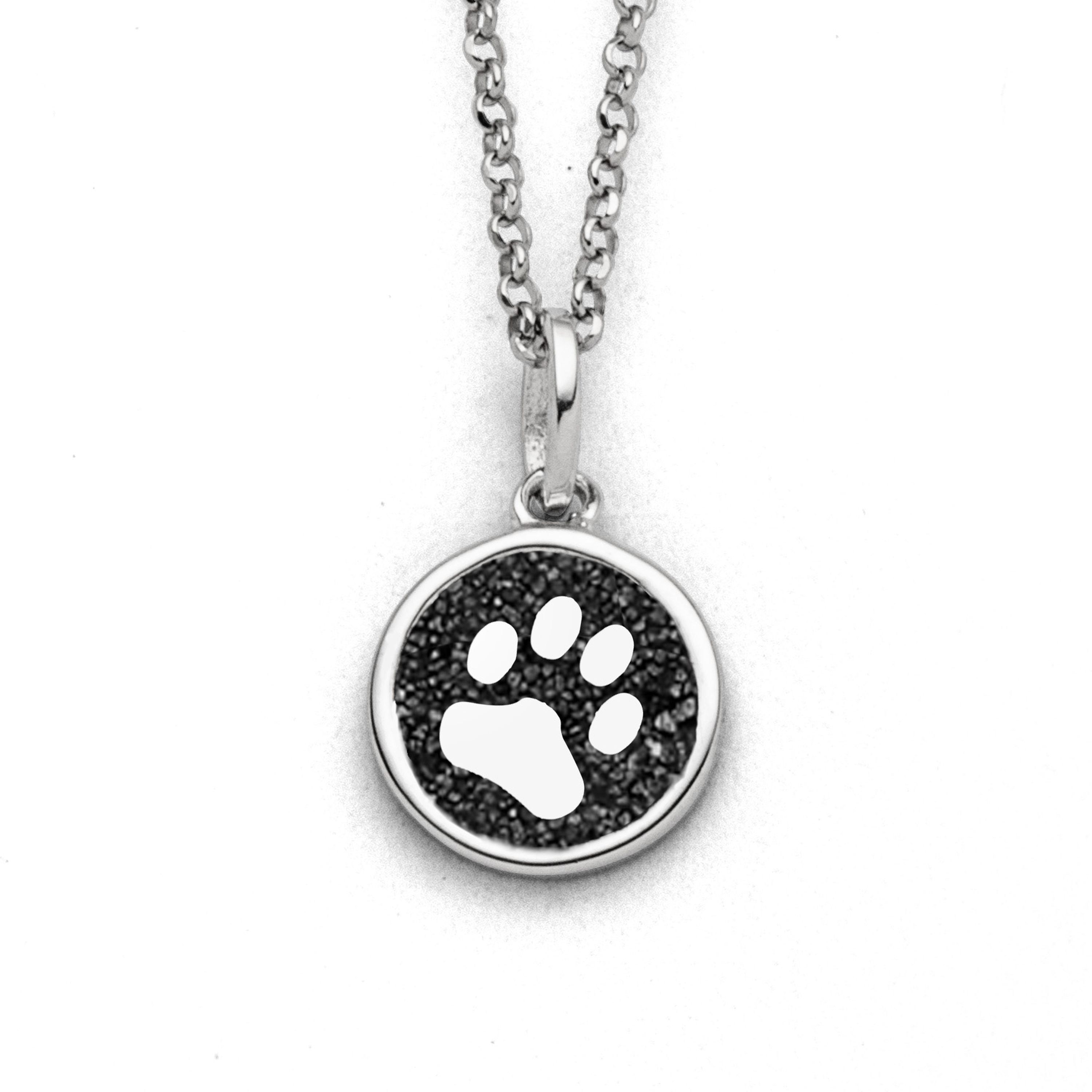 Runder 10 mm Anhänger mit einer in Lavasand gebetteten Hundepfote, aus poliertem, rhodiniertem 925er Sterling-Silber