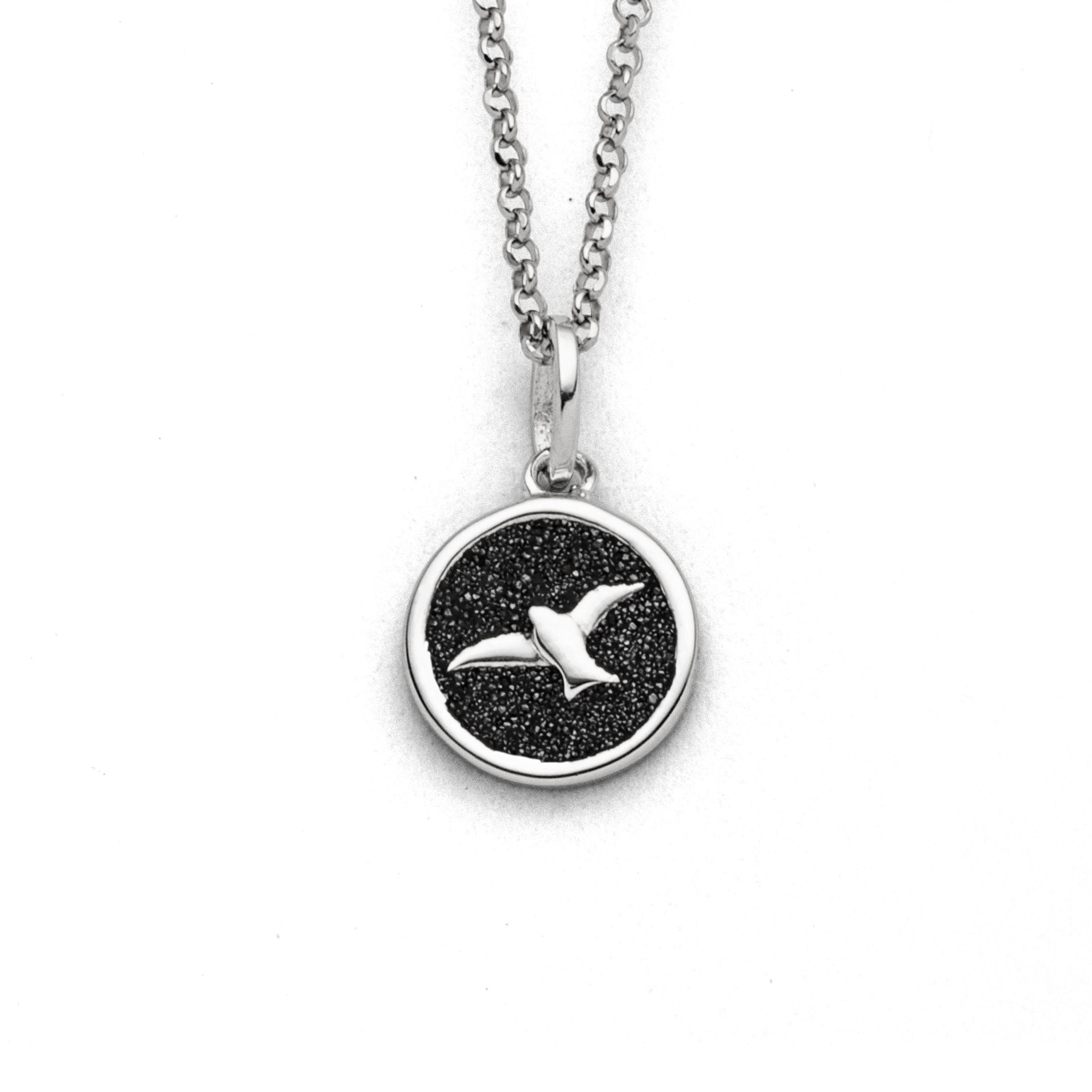 Runder 10 mm Anhänger "Möwe 2.0" in dem sich eine in Lavasand gebettete Möwe befindet, aus poliertem und rhodiniertem 925er Sterling-Silber