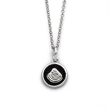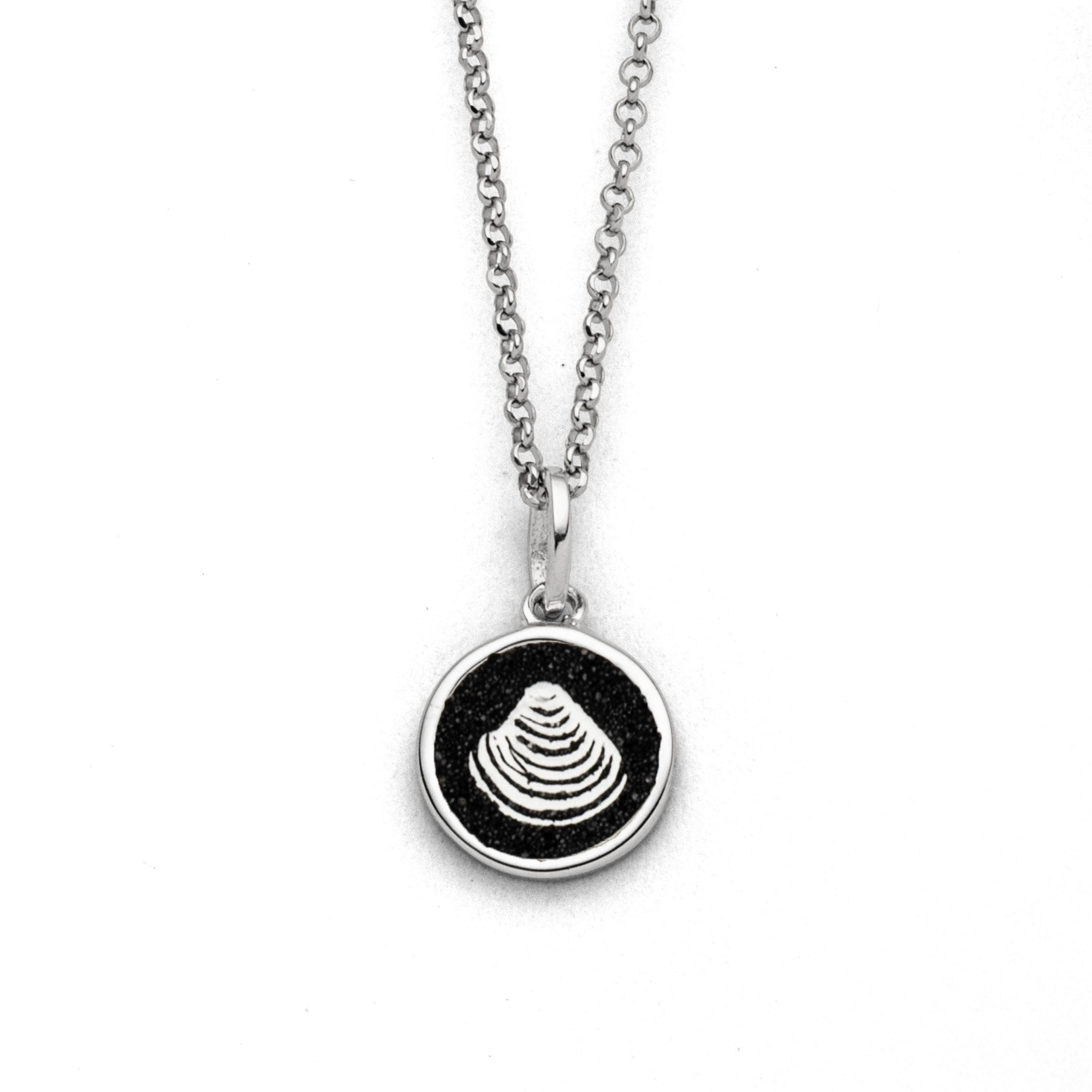 Runder 10 mm Anhänger, in dem sich eine in Lavasand gebettete Muschel befindet, aus poliertem und rhodiniertem 925er Sterling-Silber.
