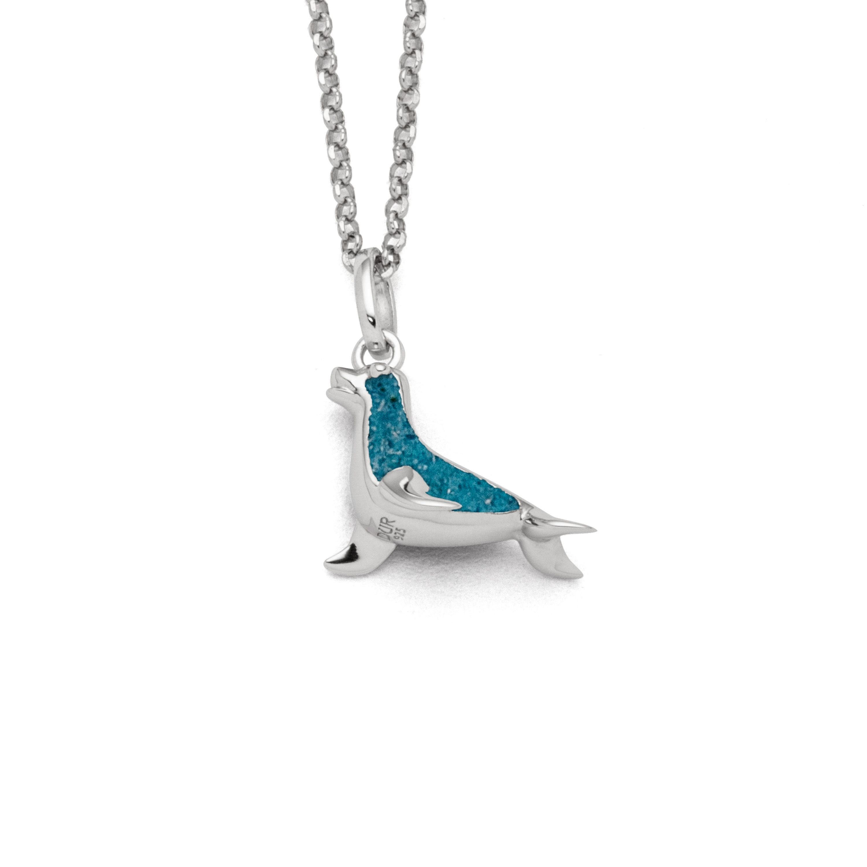 Echte Sehnsucht: Anhänger in Form eines Seehundes, gefüllt mit blauem Kyanitsteinsand, alles aus poliertem und rhodiniertem 925er Sterling-Silber. Durch die Rhodinierung ist das Schmuckstück anlaufgeschützt.