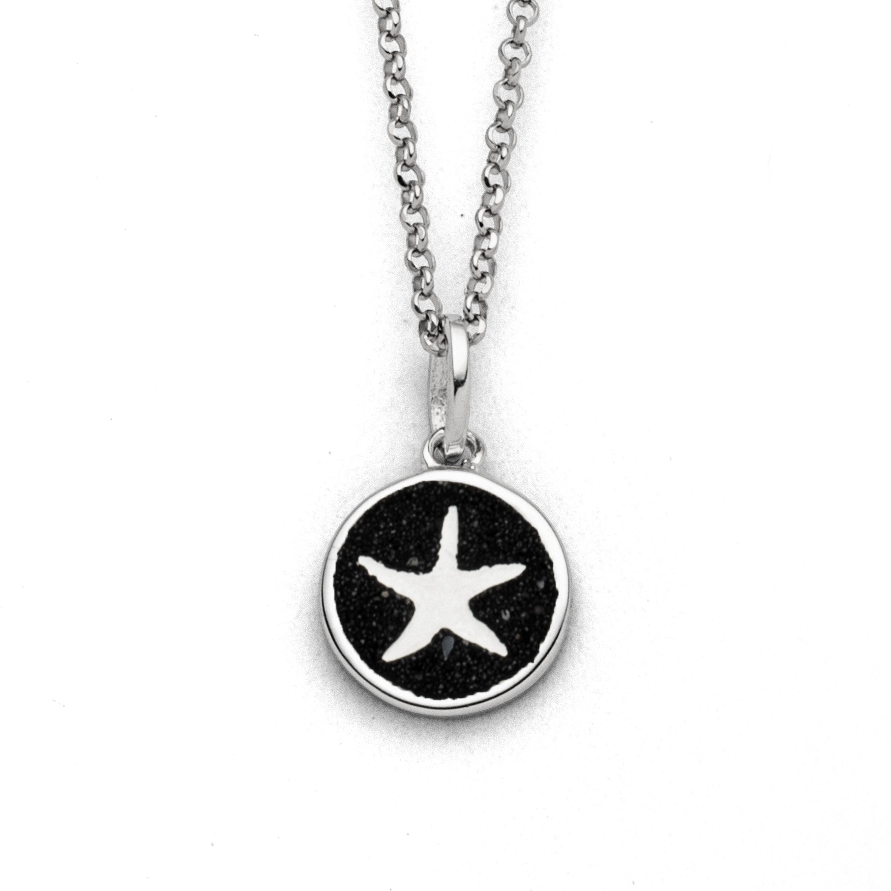 Runder 10 mm Anhänger "Seestern 2.0" mit einem in Lavasand gebetteten Seestern, aus poliertem und rhodiniertem 925er Sterling-Silber.
