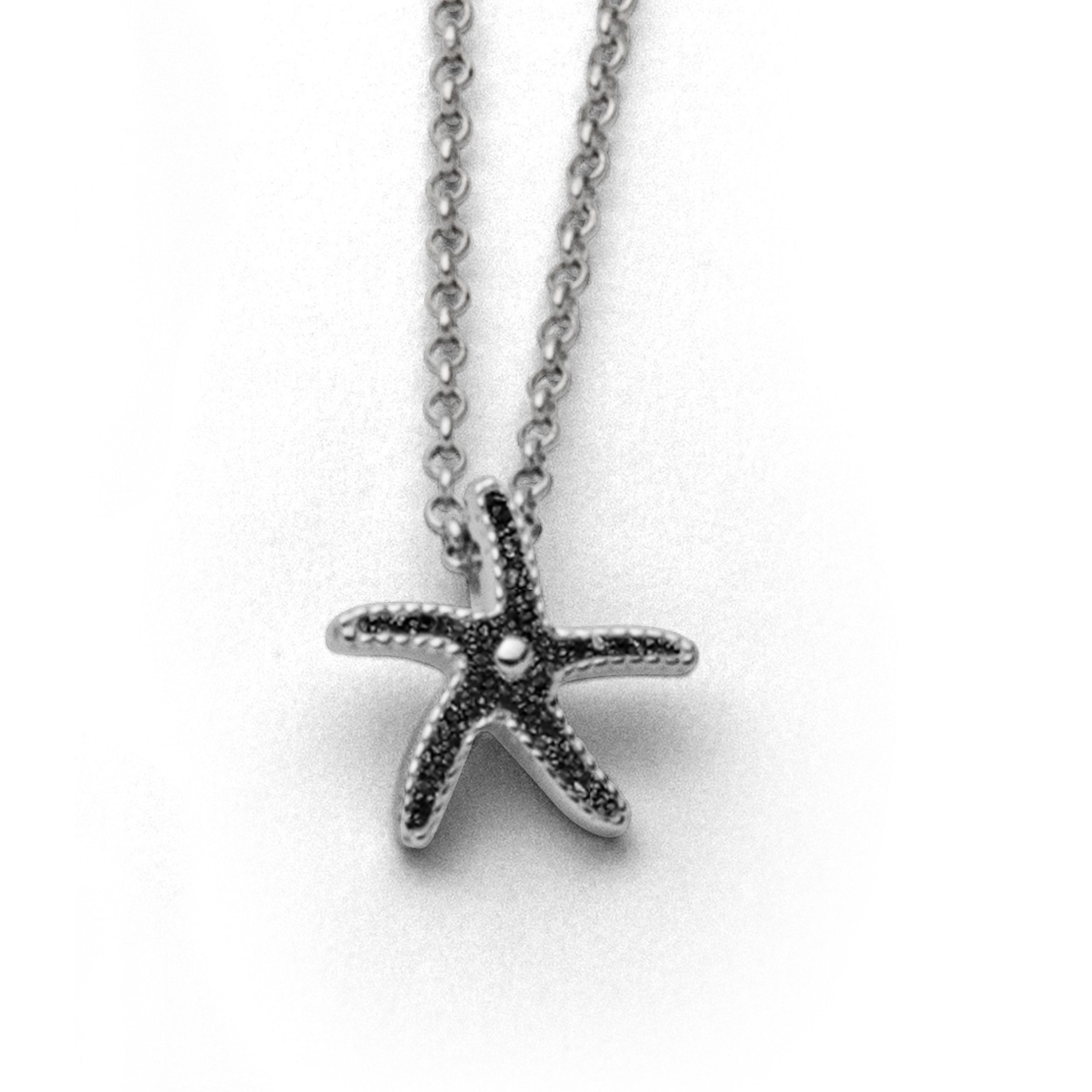 Anhänger in Form eines Seesterns, gefüllt mit Lavasand, aus rhodiniertem 925er Sterlingsilber. Duch die Rhodinierung ist das Schmuckstück anlaufgeschützt.