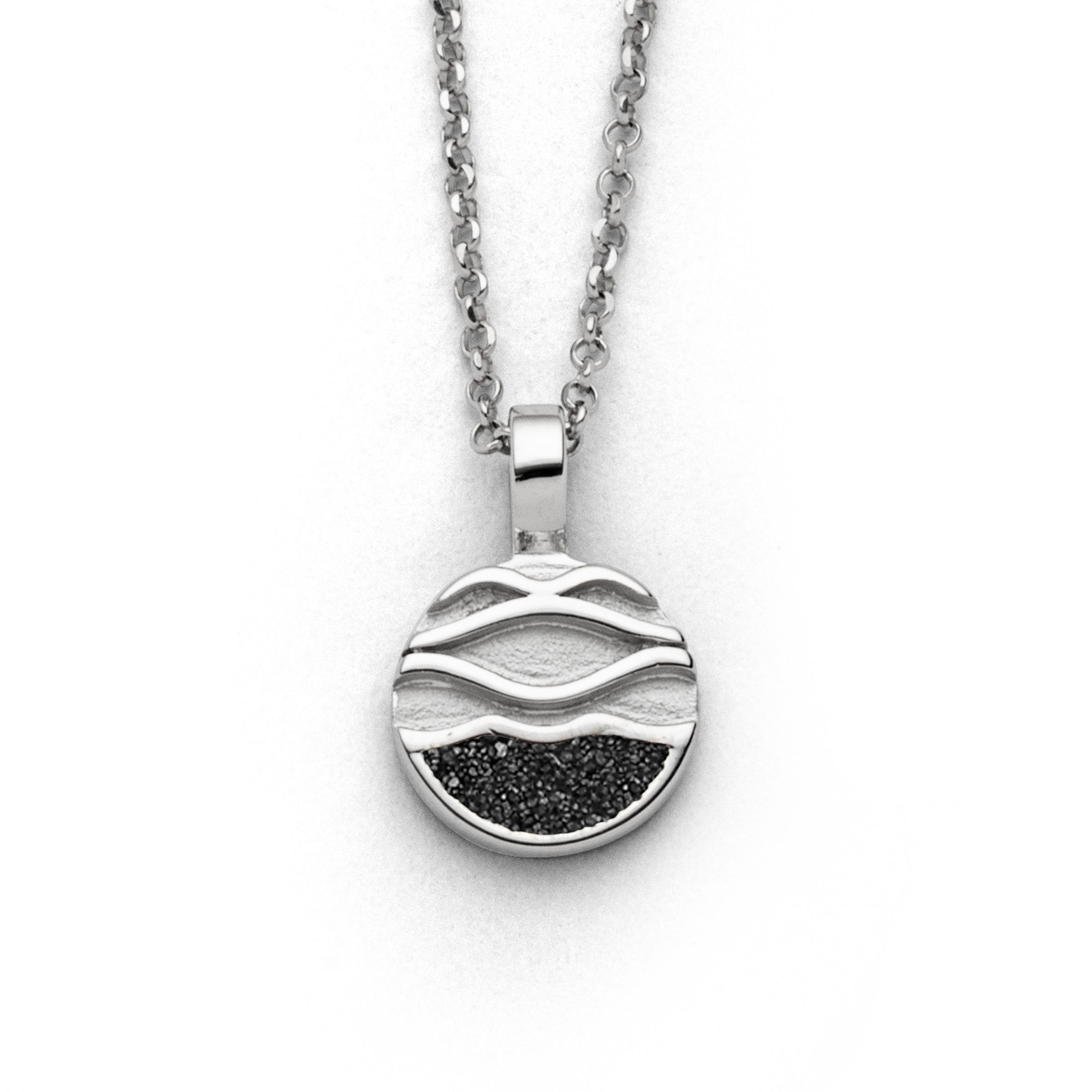 Runder 10 mm "Strandwellen 2.0" Anhänger der im unteren Drittel mit Lavasand gefüllt ist. Aus poliertem und rhodiniertem 925er Sterling-Silber. Durch die Rhodinierung ist das Schmuckstück anlaufgeschützt.