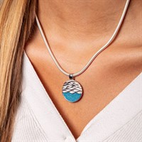 Runder Anhänger "Strandwellen" im unteren Drittel mit blauem Steinsand gefüllt und großer Öse aus rhodiniertem 925er Sterlingsilber.