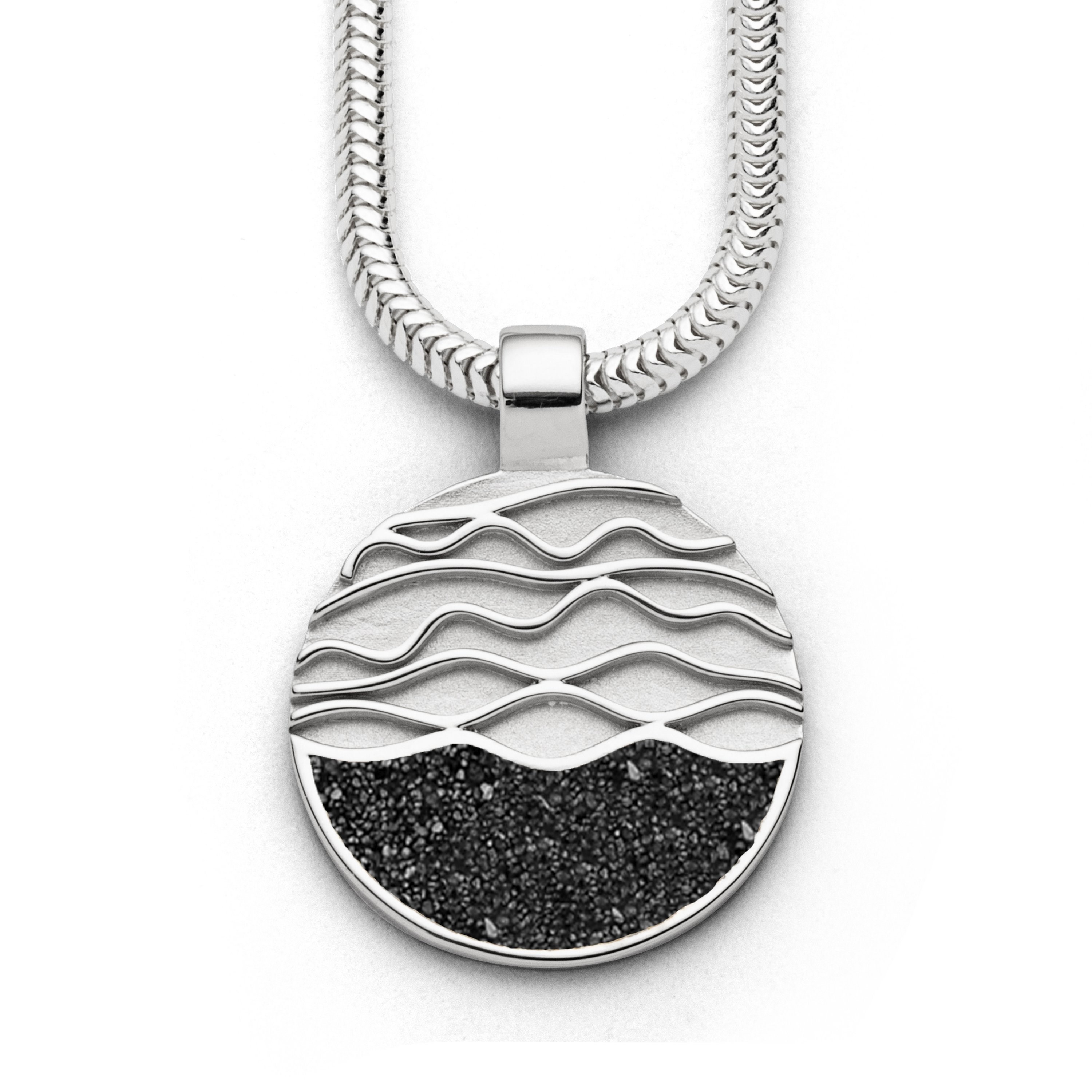 Runder Anhänger "Strandwellen", im unteren Drittel mit Lavasand gefüllt. Durch die große Öse ist eine Kombination mit verschiedenen Ketten möglich, zum Beispiel mit einer schwarz rhodinierten Kugelkette. Gefertigt aus rhodiniertem 925er Sterlingsilber. Durch die Rhodinierung ist das Schmuckstück anlaufgeschützt.