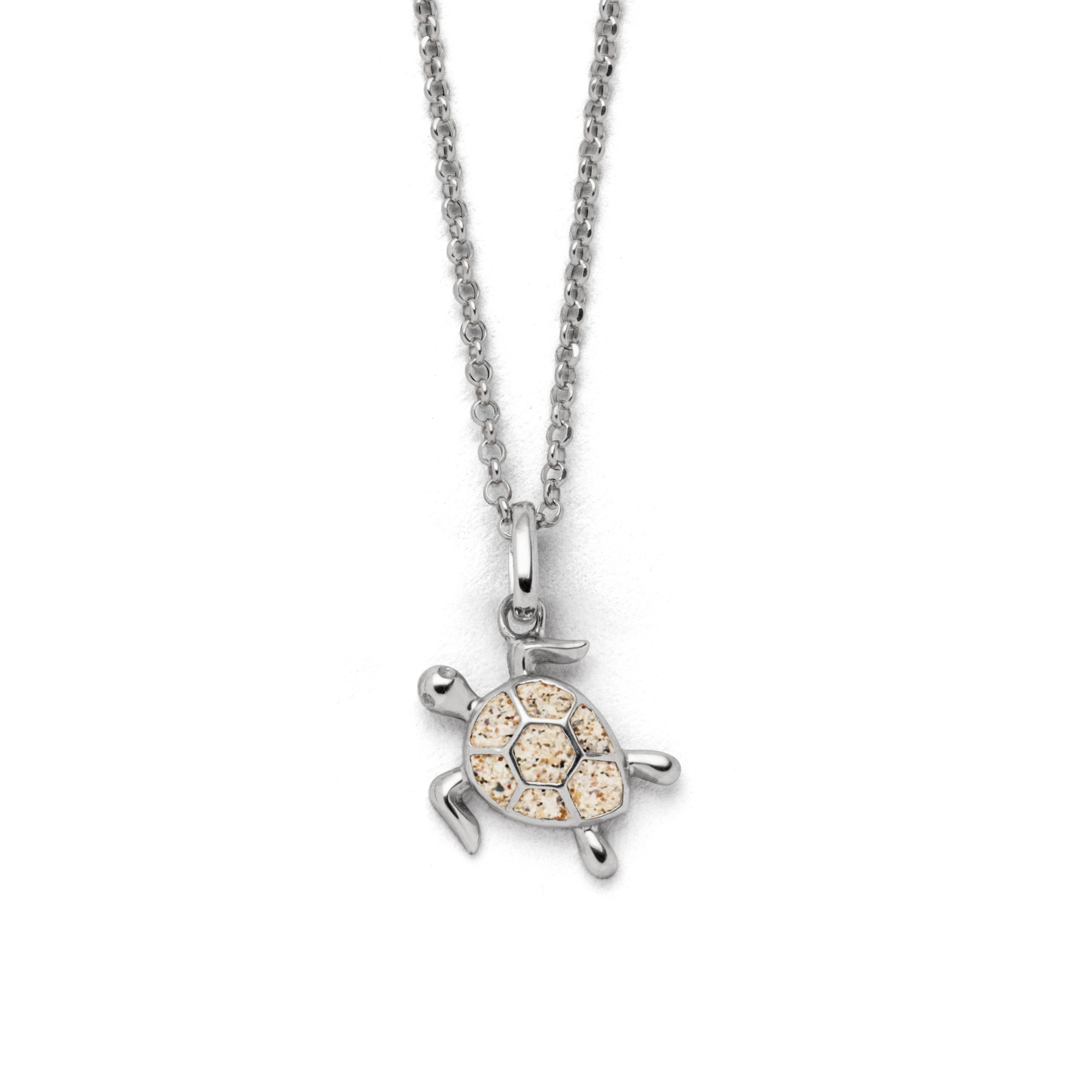 Echte Sehnsucht: Anhänger in Form einer Schildkröte, gefüllt mit Strandsand, alles aus poliertem und rhodiniertem 925er Sterling-Silber. Durch die Rhodinierung ist das Schmuckstück anlaufgeschützt.