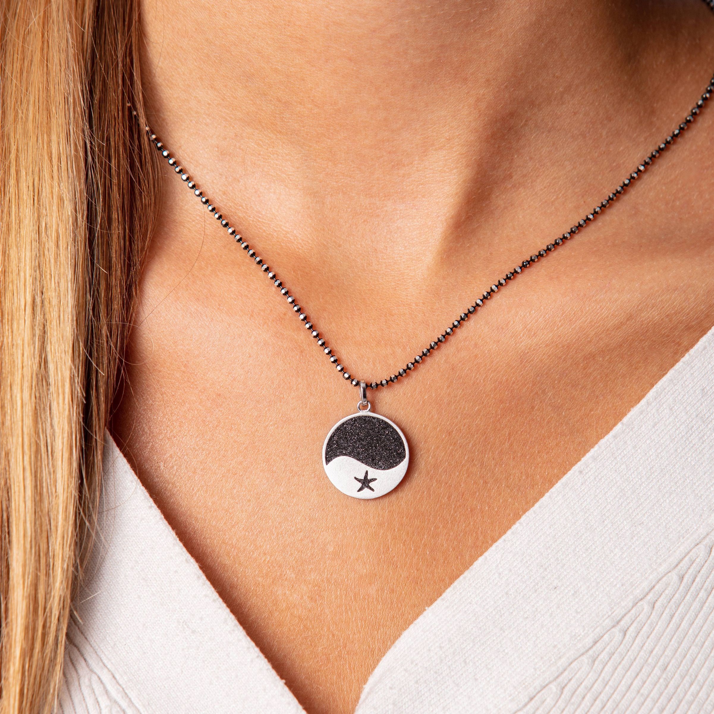 Runder Anhänger mit einer Welle und Seestern, zur Hälfte eingebettet in Lavasand und gefasst in rhodiniertem, mattiertem 925er Sterling-Silber.