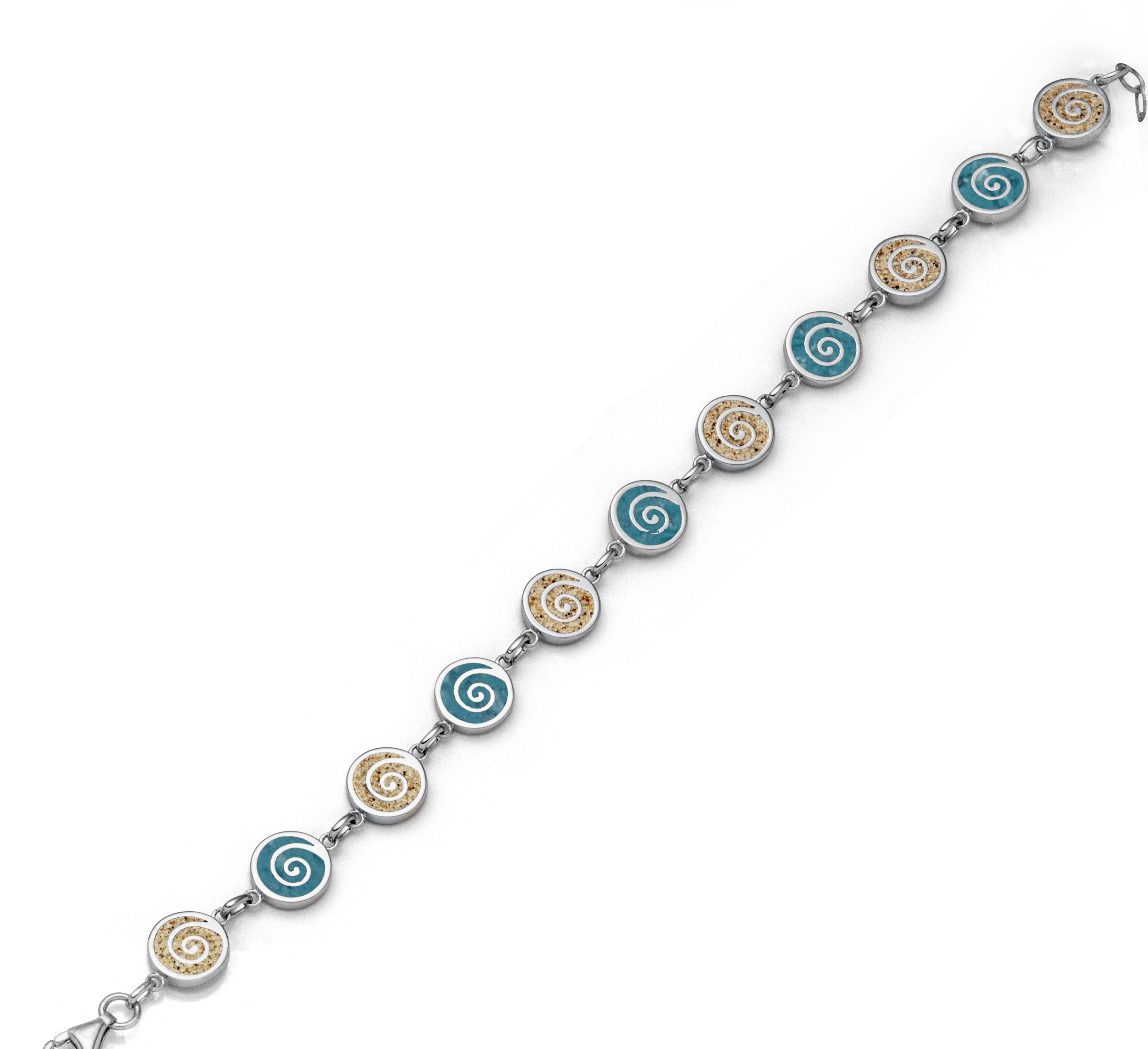 Flaches, feines Armband "Spirale 2.0" mit 11 runden Spiralelementen, gefüllt mit Strandsand und blauem Steinsand (Kyanit) im Wechsel, alles gefasst in rhodiniertem 925er Sterling-Silber, ca. 16,5 cm lang + 3 cm Verlängerung