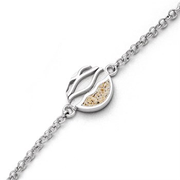 Armband "Strandwellen" mit einem runden, mit Strandsand gefüllten Element aus rhodiniertem 925er Sterling-Silber, ca.16.5 cm lang plus 3cm Verlängerung. Durch die Rhodinierung ist das Schmuckstück anlaufgeschützt.