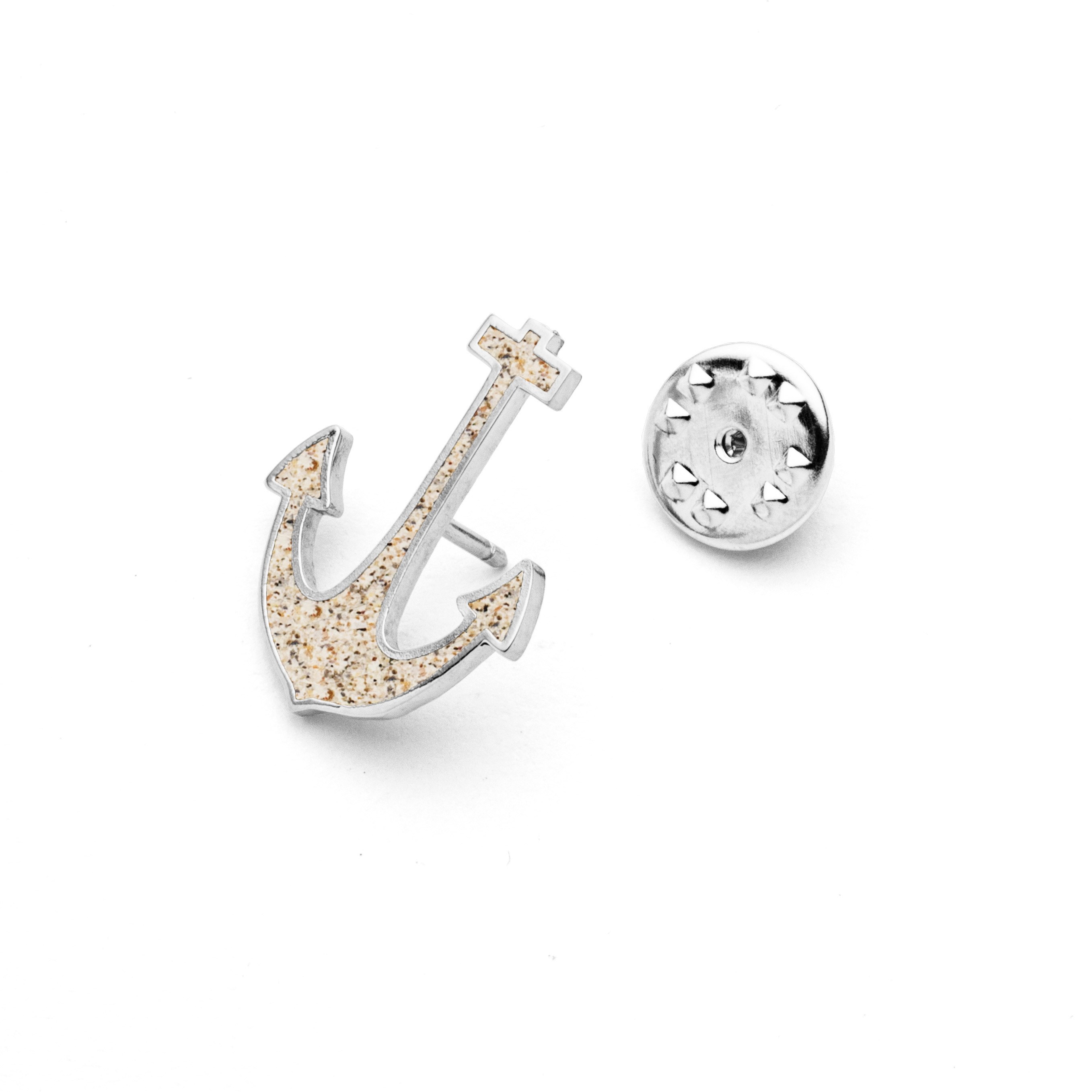Anstecker "Anker" aus Edelstahl, gefüllt mit Strandsand.