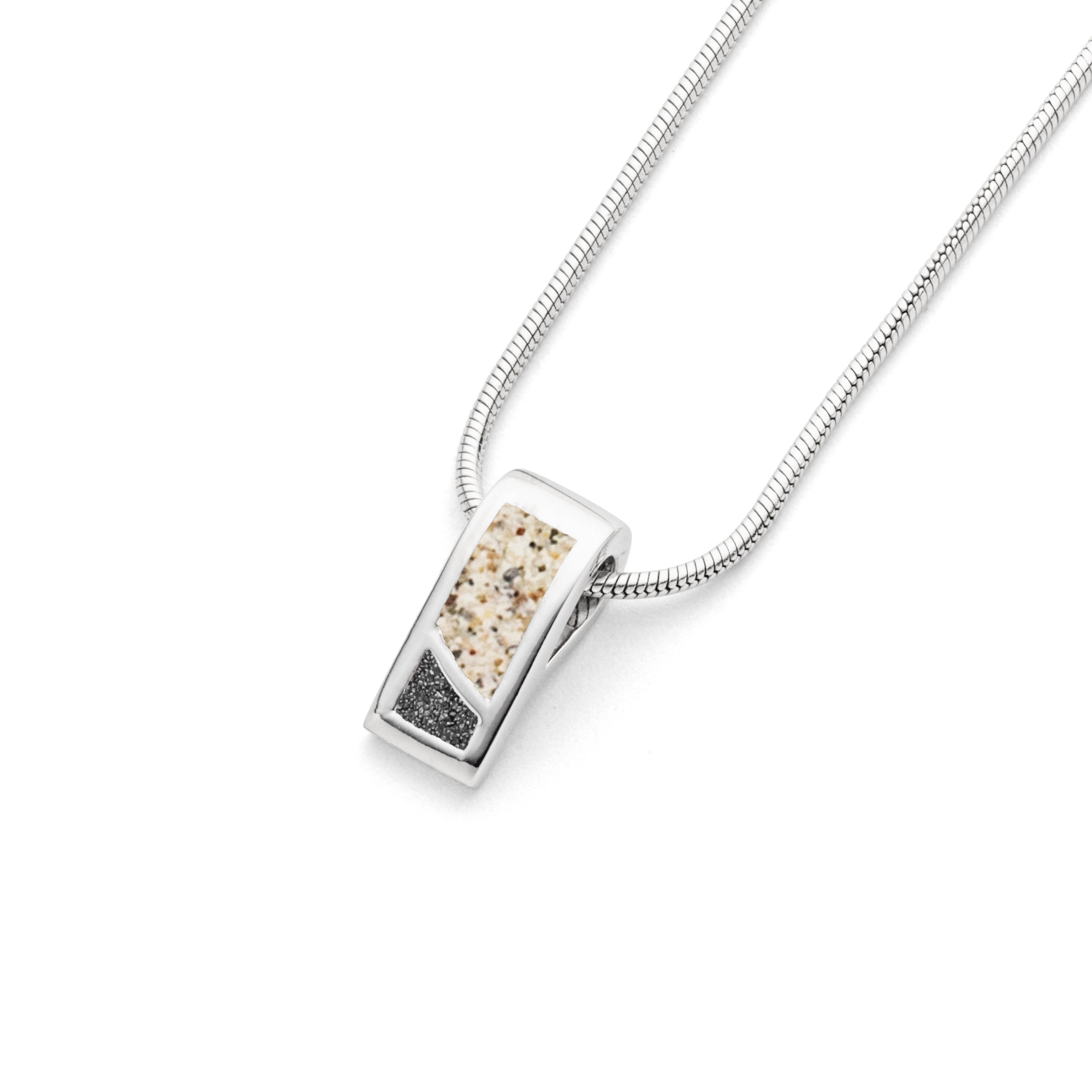 Kette "Duett", länglich, eckiger Anhänger mit zweierlei Füllung aus Strandsand und Lavasand, getrennt durch eine feine Silberlinie, an einer ca. 45 cm langen Schlangenkette, alles aus rhodiniertem 925er Sterlingsilber.