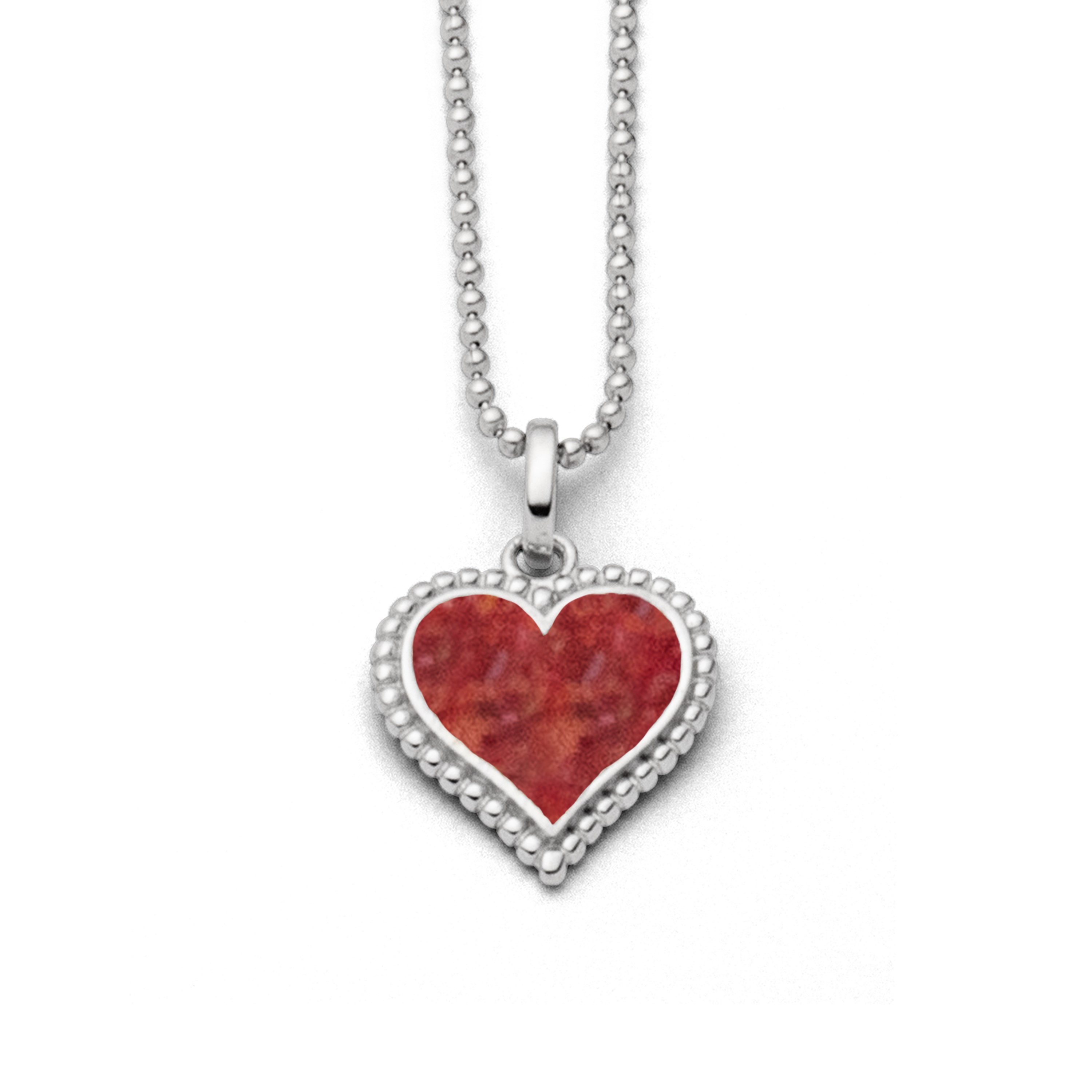Kette "Herz" mit einem mit Koralle gefüllten Herzanhänger, umrahmt von kleinen Silberkügelchen. Gefasst in rhodinierten 925er Sterlingsilber und kombiniert mit einer zarten, ebenfalls rhodinierten Kugelkette in der Länge 45 cm. Durch die Rhodinierung ist das Schmuckstück anlaufgeschützt.