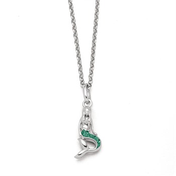 Echte Sehnsucht: Feine Erbskette rhodiniert mit einem Anhänger in Form einer Meerjungfrau, die Flosse gefüllt mit grünem Steinsand, alles aus poliertem und rhodiniertem 925er Sterling-Silber, ca. 42 cm lang. Durch die Rhodinierung ist das Schmuckstück anlaufgeschützt.