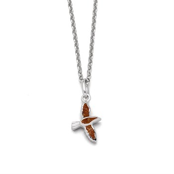 Echte Sehnsucht: Feine Erbskette rhodiniert mit einem Anhänger in Form einer Möwe, gefüllt mit Bernsteinsand, alles aus poliertem und rhodiniertem 925er Sterling-Silber, ca. 42 cm lang. Durch die Rhodinierung ist das Schmuckstück anlaufgeschützt.