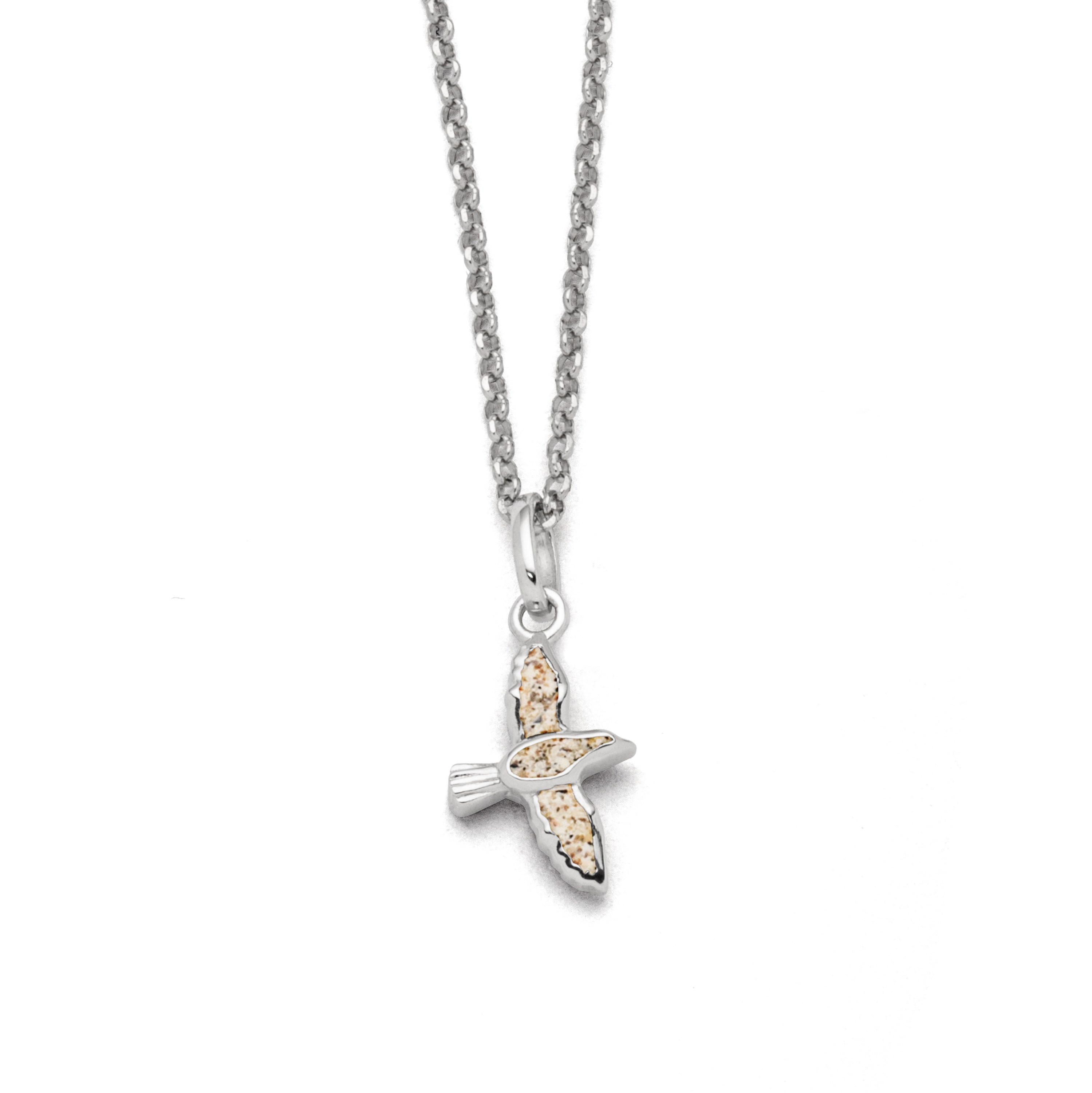 Echte Sehnsucht: Feine Erbskette rhodiniert mit einem Anhänger in Form einer Möwe, gefüllt mit Strandsand, alles aus poliertem und rhodiniertem 925er Sterling-Silber, ca. 42 cm lang. Durch die Rhodinierung ist das Schmuckstück anlaufgeschützt.