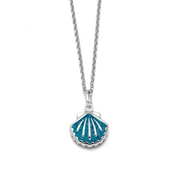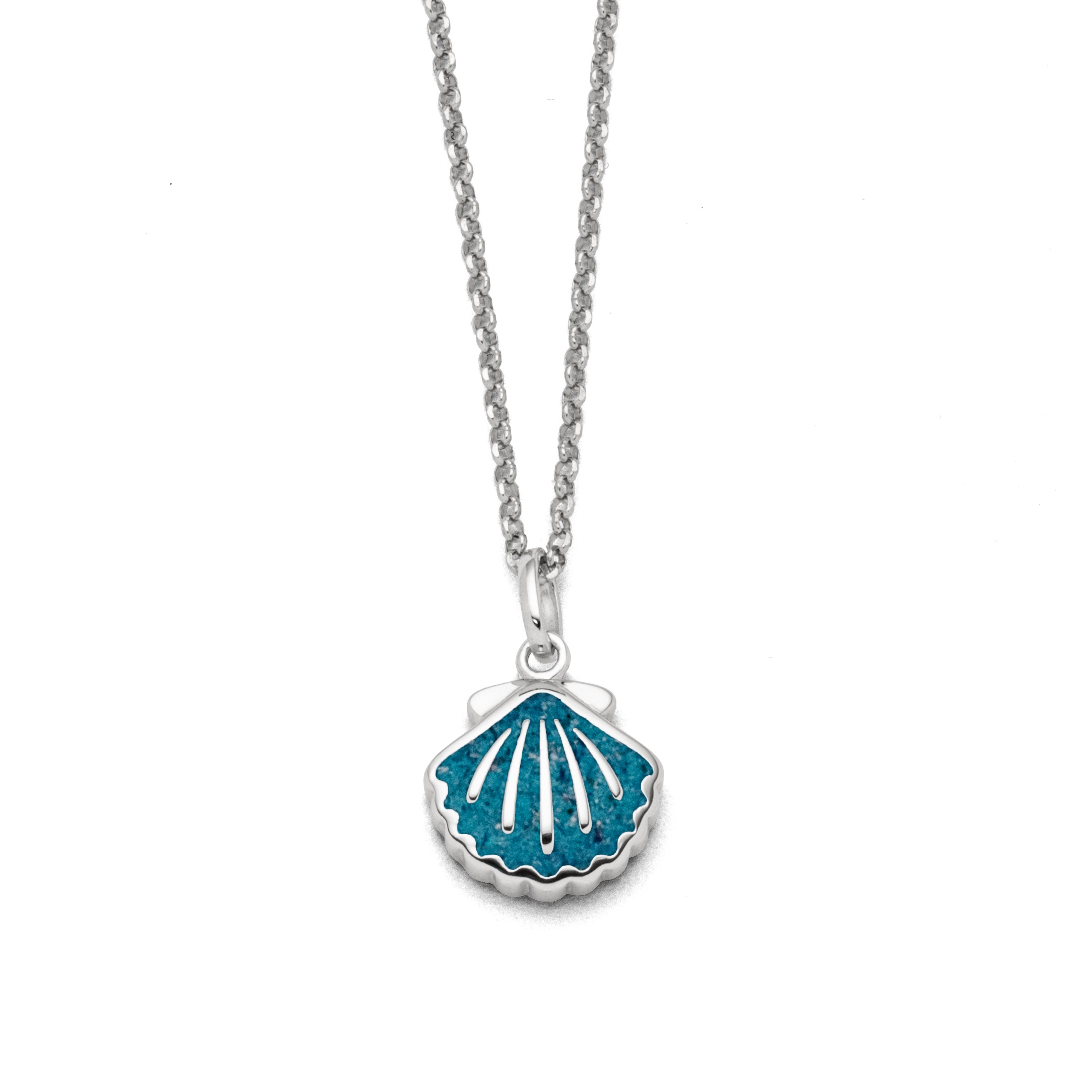 Echte Sehnsucht: Feine Erbskette rhodiniert mit einem Anhänger in Form einer Muschel, gefüllt mit blauem Kyanitsteinsand und alles aus poliertem und rhodiniertem 925er Sterling-Silber, ca. 45 cm lang. Durch die Rhodinierung ist das Schmuckstück anlaufgeschützt.