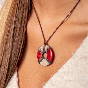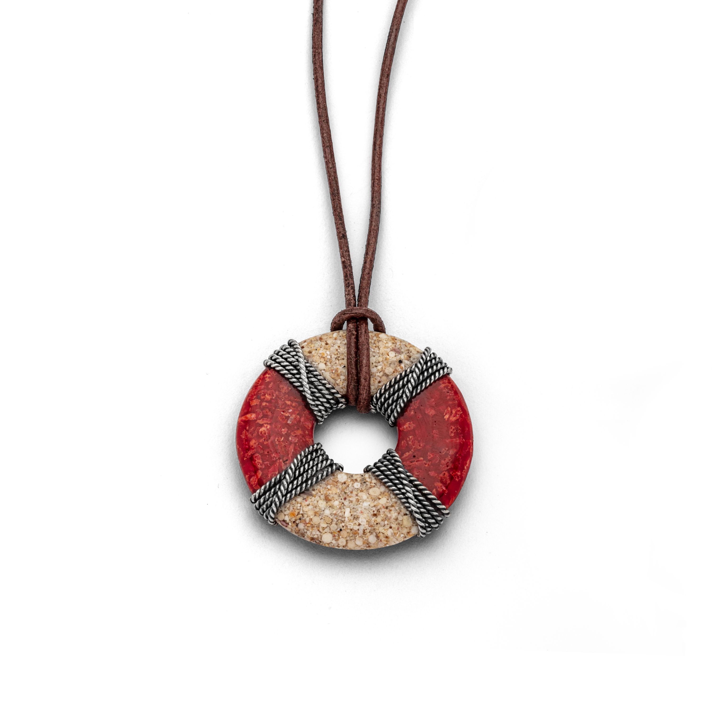 Kette "Rettungsring", handgefertigter Anhänger in Form eines Rettungsringes mit Strandsand und Mosaikkoralle im Wechsel, umwickelt mit einem oxidierten Silberdraht als Seil geflochten, an einem dunkelbraunen Ziegenlederband welches durch die Knotentechnik variabel zu verstellen ist. Das Silberseil ist aus 925/-er Sterlingsilber.