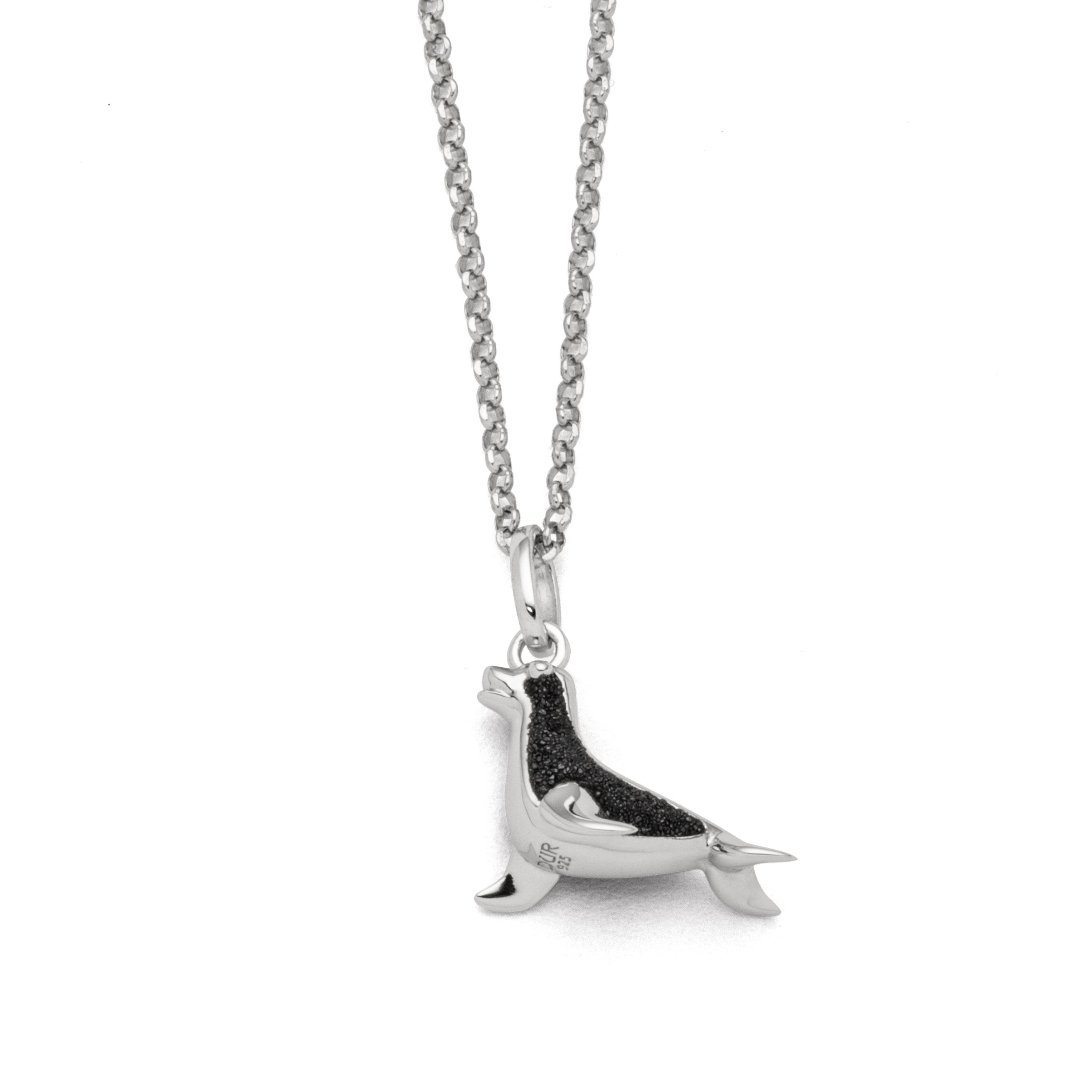Echte Sehnsucht: Feine Erbskette rhodiniert mit einem Anhänger in Form eines Seehundes, gefüllt mit Lavasand, alles aus poliertem und rhodiniertem 925er Sterling-Silber, ca. 42 cm lang. Durch die Rhodinierung ist das Schmuckstück anlaufgeschützt.