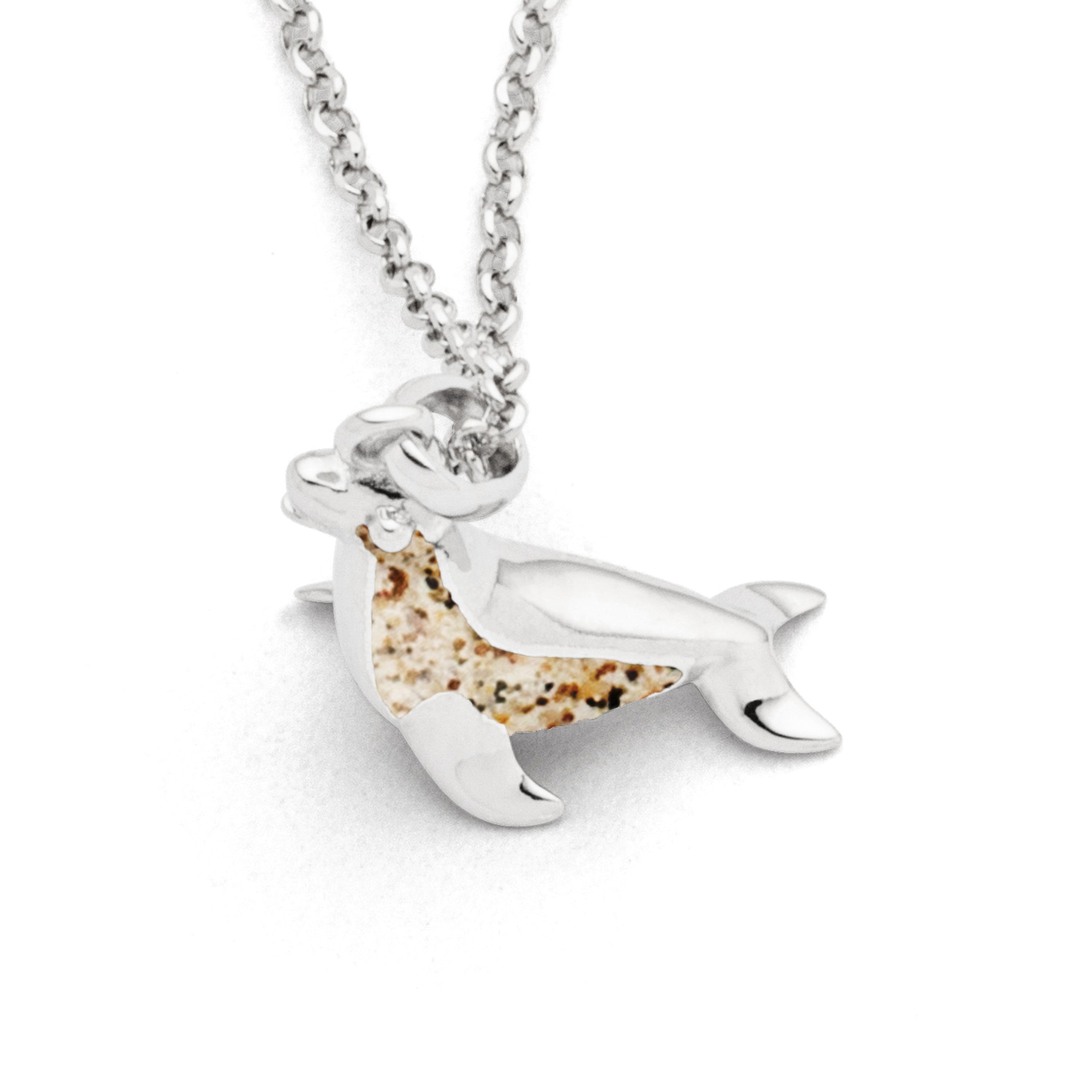 Echte Sehnsucht: Feine Erbskette rhodiniert mit einem Anhänger in Form eines Seehundes, gefüllt mit Strandsand, alles aus poliertem und rhodiniertem 925er Sterling-Silber, ca. 42 cm lang. Durch die Rhodinierung ist das Schmuckstück anlaufgeschützt.