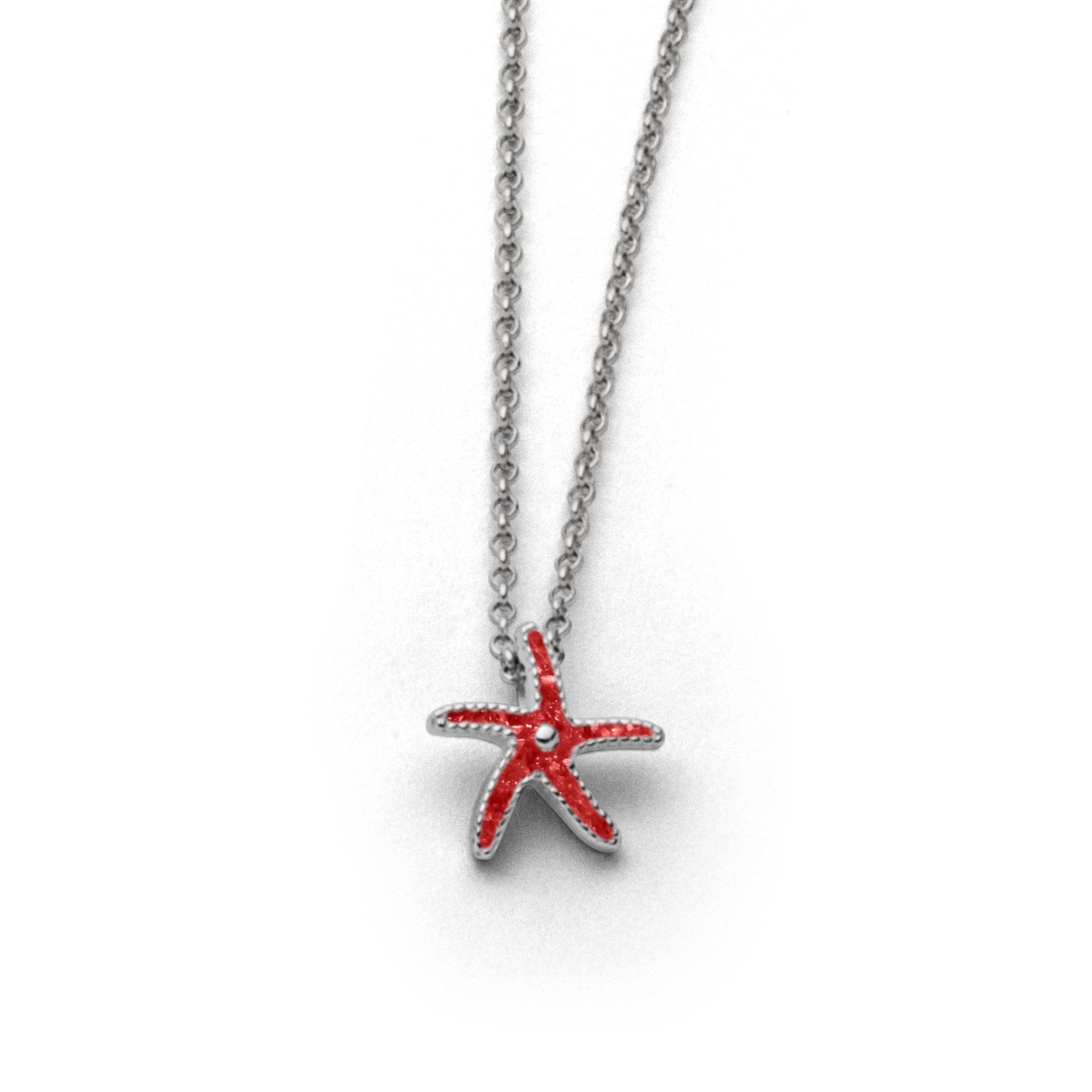 Die feine Erbskette (42 cm lang) verzaubert mit klarem, glänzenden Design und besticht durch einen zierlichen Anhänger in Form eines Seesterns, der mit echter gemahlener Koralle gefüllt ist. Verziert wird der Anhänger durch ein kleines, mittig gesetztes Silberkügelchen.