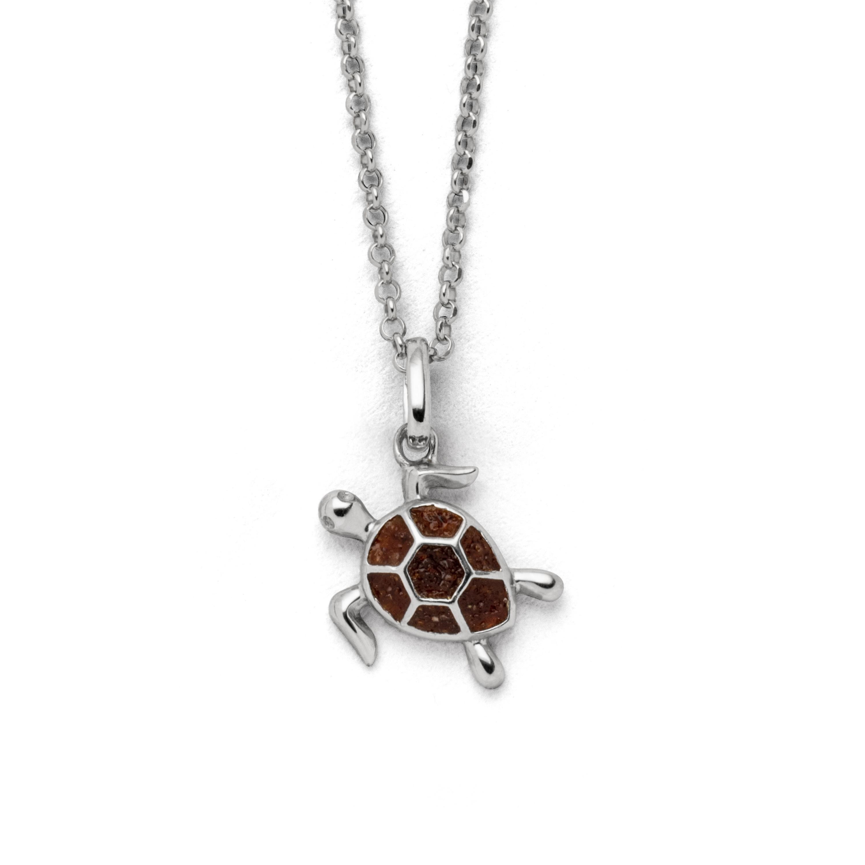 Echte Sehnsucht: Feine Erbskette rhodiniert mit einem Anhänger in Form einer Schildkröte, gefüllt mit Bernsteinsand, alles aus poliertem und rhodiniertem 925er Sterling-Silber, ca. 42 cm lang. Durch die Rhodinierung ist das Schmuckstück anlaufgeschützt.
