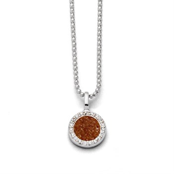 Kette "Wasserflimmern 2.0" aus rhodiniertem 925er Sterling-Silber mit einem kleinen runden, mit Bernsteinsand gefüllten Anhänger. Die am Rand eingesetzten 19 Zirkoniasteine erinnern an das "Wasserflimmern" am Strand. Getragen wird der Anhänger an einer zarten, ebenfalls rhodinierten, 42 cm langen Kugelkette. Durch die Rhodinierung ist das Schmuckstück anlaufgeschützt.