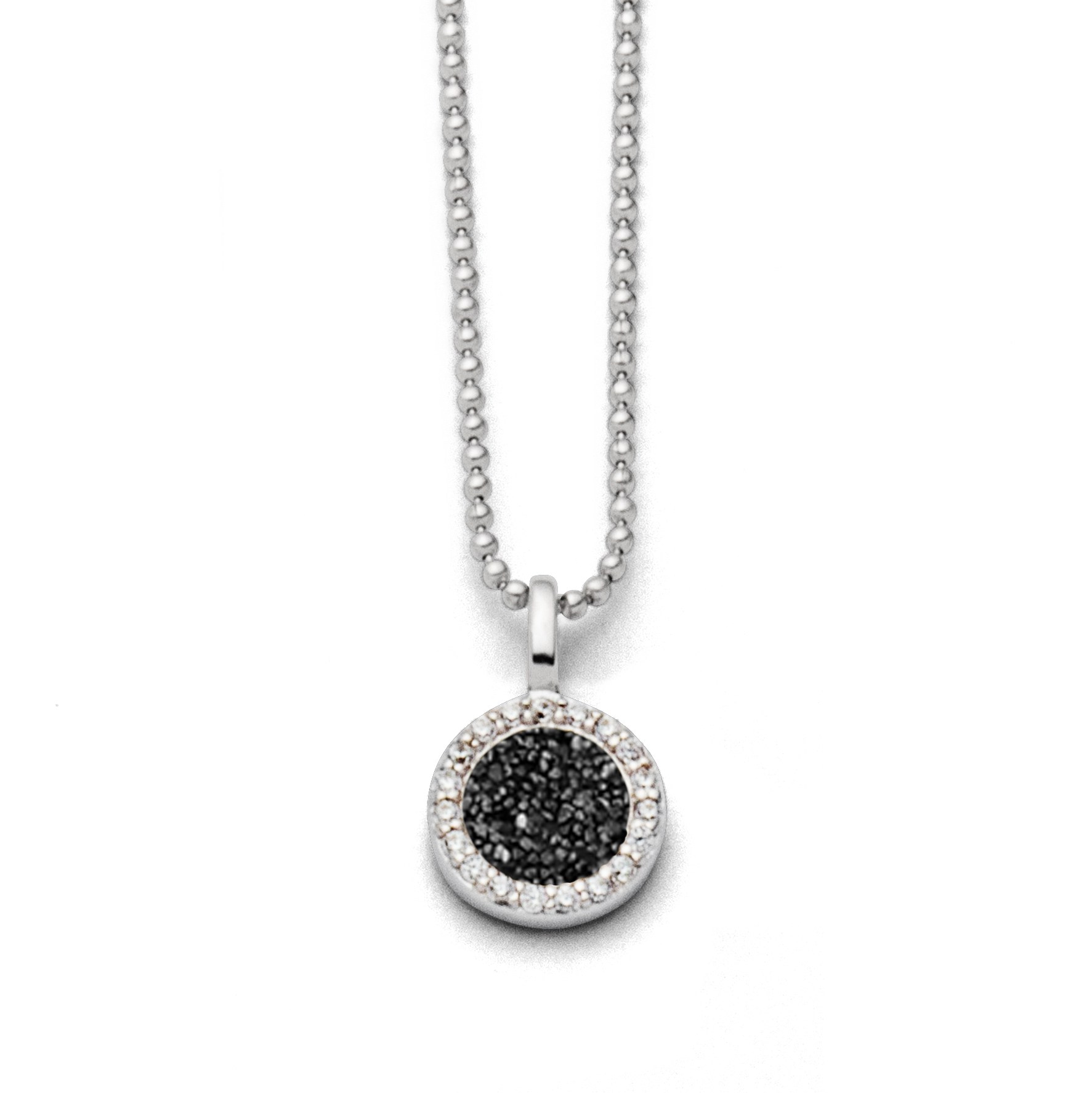 Kette "Wasserflimmern 2.0" aus rhodiniertem 925er Sterling-Silber mit einem kleinen runden, mit Lavasand gefüllten Anhänger. Die am Rand eingesetzten 19 Zirkoniasteine erinnern an das "Wasserflimmern" am Strand. Getragen wird der Anhänger an einer zarten, ebenfalls rhodinierten, 45 cm langen, geschliffenen Kugelkette. Durch die Rhodinierung ist das Schmuckstück anlaufgeschützt.