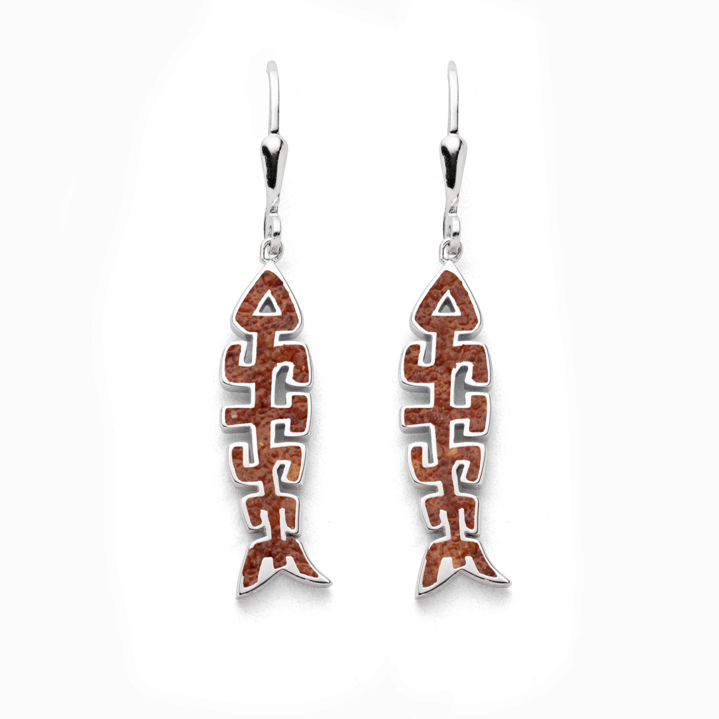 Ohrhänger Fischgräte mit "Ostsee"- Schriftzug in Fischform, gefüllt mit Bernsteinsand (zermalene Bernsteinreste) alles aus poliertem, rhodiniertem 925er Sterlingsilber.