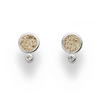 Zierlicher, runder Ohrring "Polarstern", gefüllt mit Strandsand, der durch die Kombination mit einem kleinen Zirkoniastein am unteren Rand wie ein "Polarstern" erstrahlt. Alles gefasst in rhodiniertem 925er Sterlingsilber. Durch die Rhodinierung ist das Schmuckstück anlaufgeschützt.