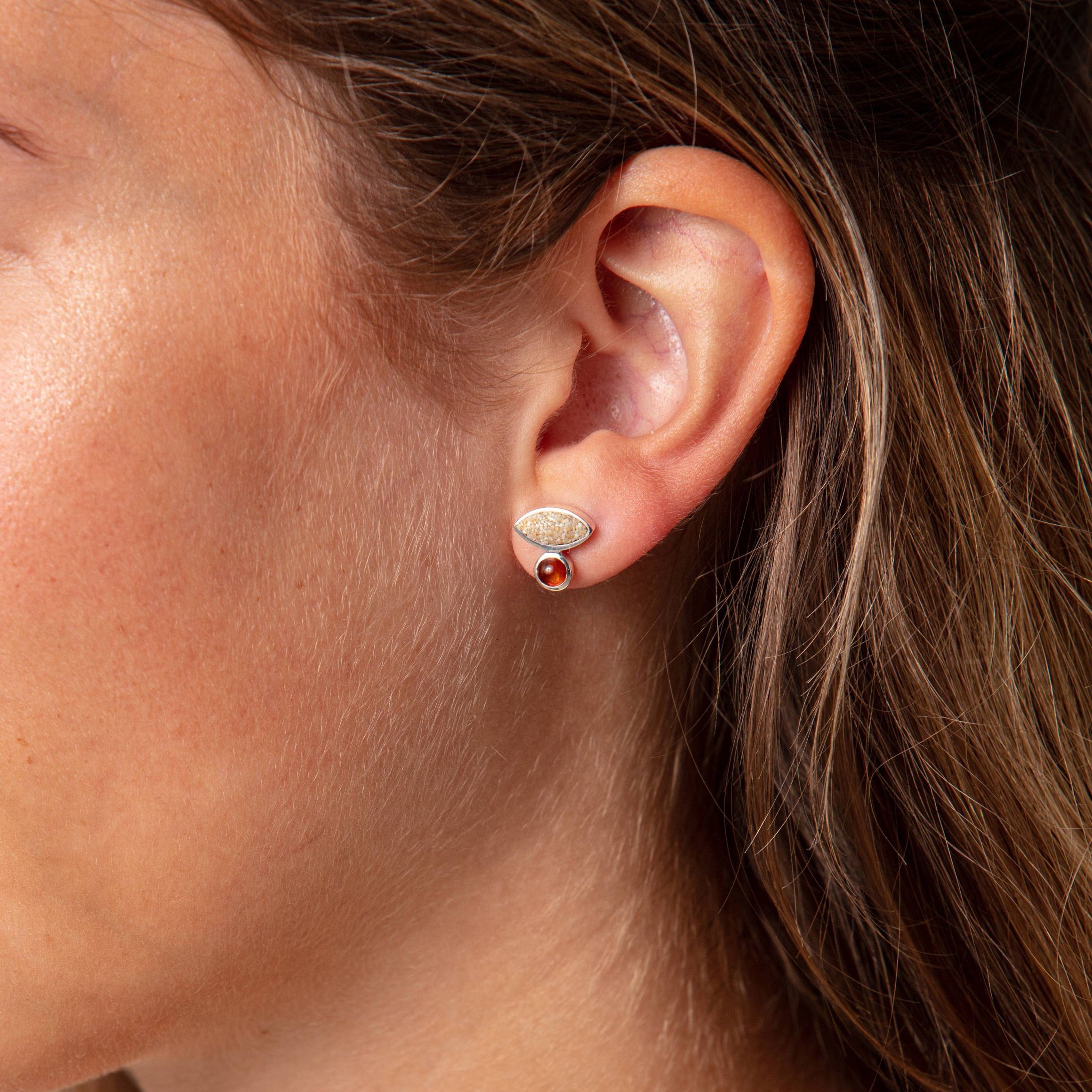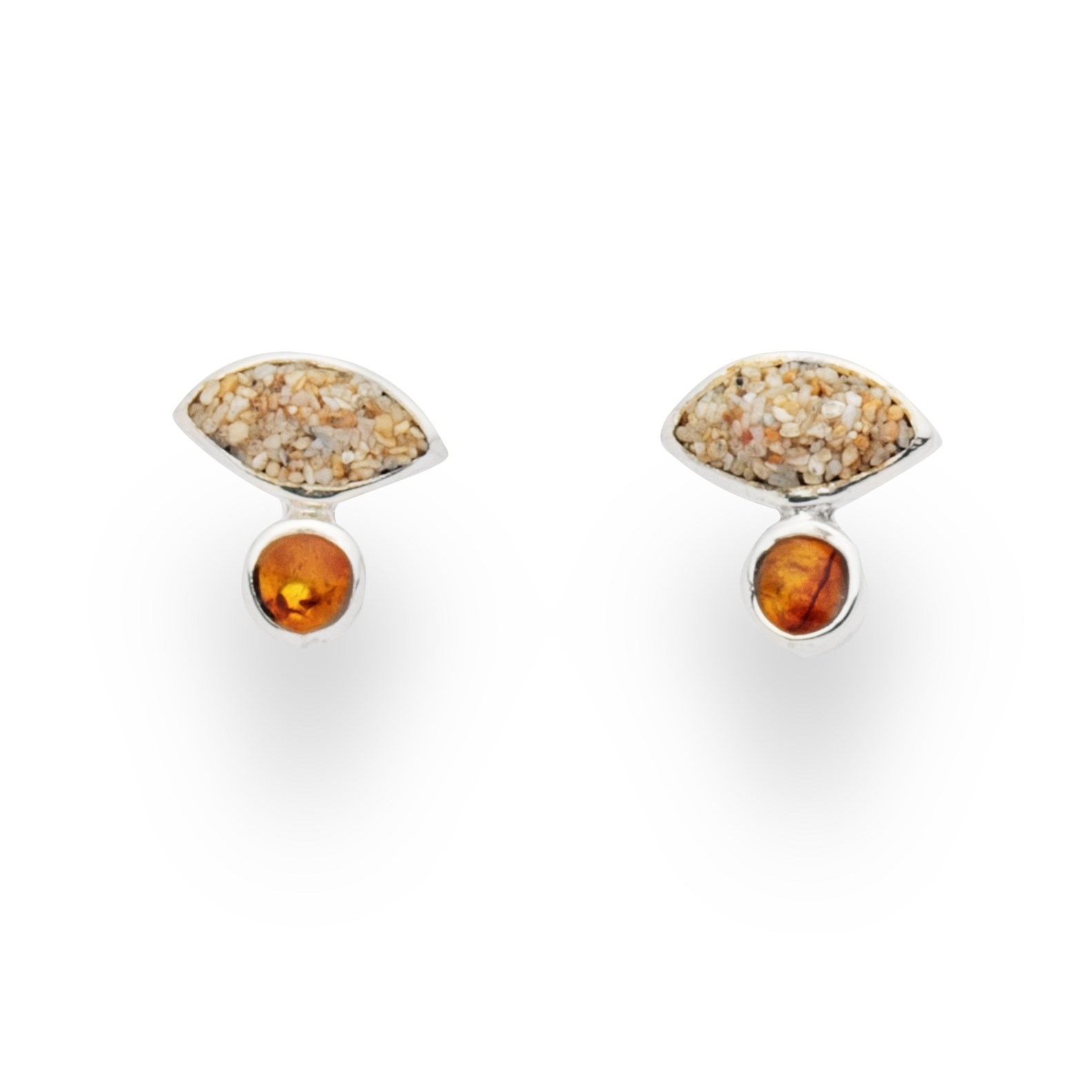 Ohrring "Sandbank" mit einem spitz-ovalen Strandsand -Element und einem kleinen runden Bernstein, gefaßt in 925er Sterling-Silber