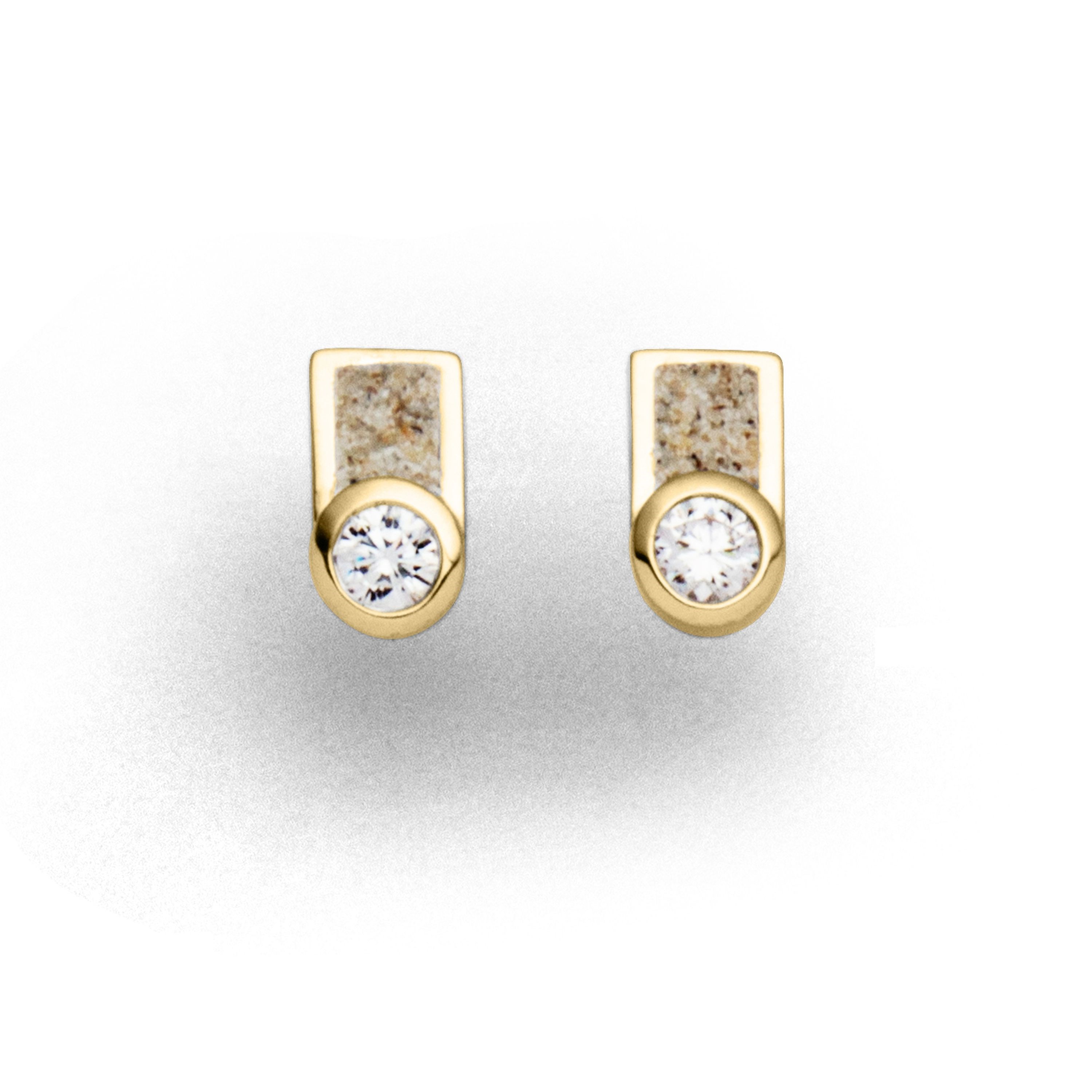 Zierlicher, eckiger Ohrring "Venus", gefüllt mit Strandsand, der durch die Kombination mit einem kleinen Zirkoniastein am unteren Rand wie der hellste Planet am Himmel, die "Venus" erstrahlt. Alles gefasst in vergoldetem 925er Sterlingsilber.