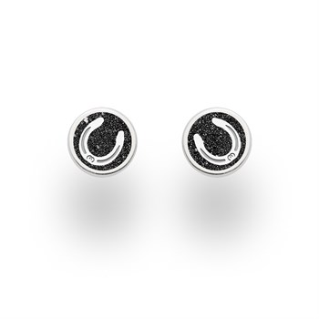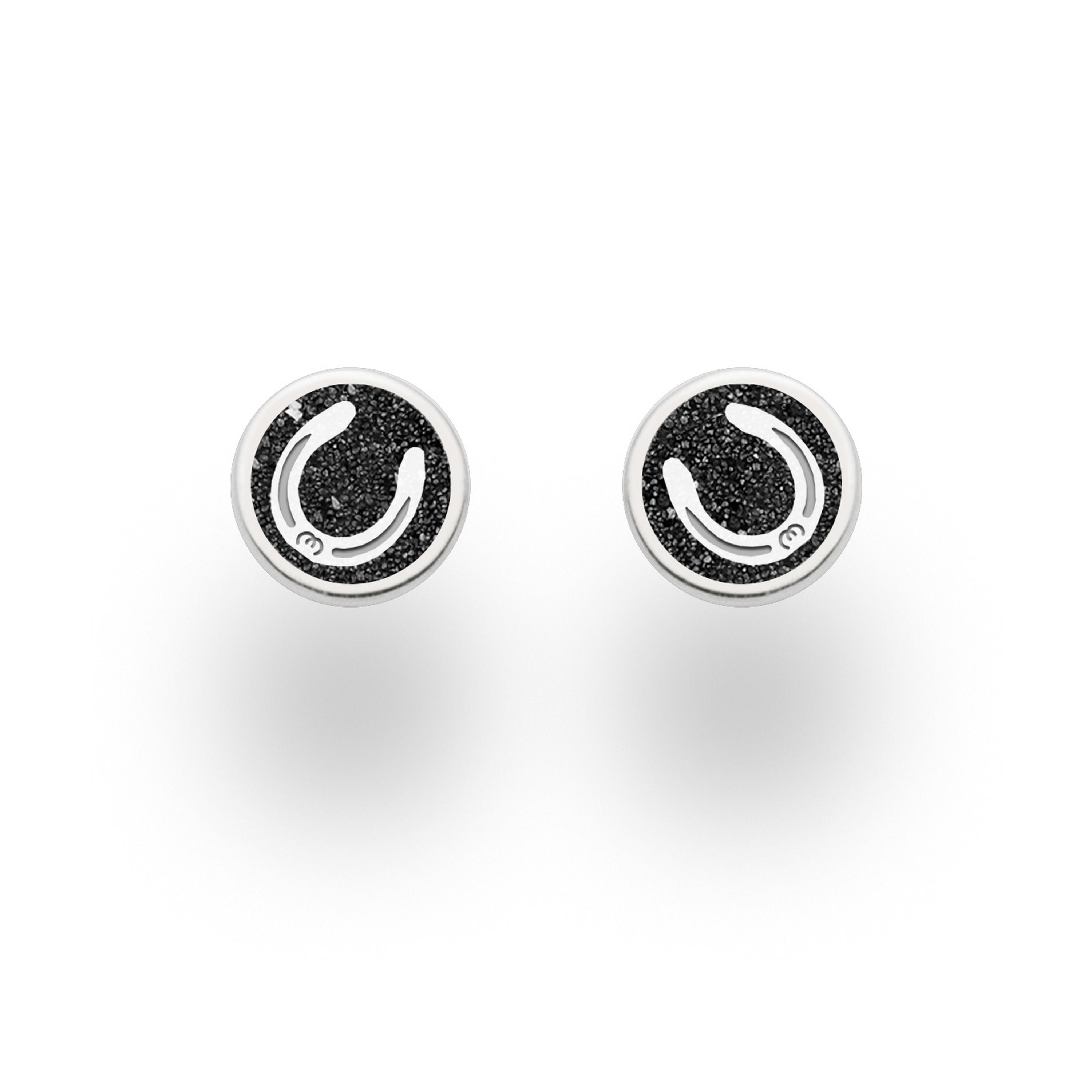 Runder Ohrstecker Pferdeglück "Hufeisen" gefüllt mit Lavasand und einem Hufeisen aus Silber, gefasst in rhodiniertem 925er Silber