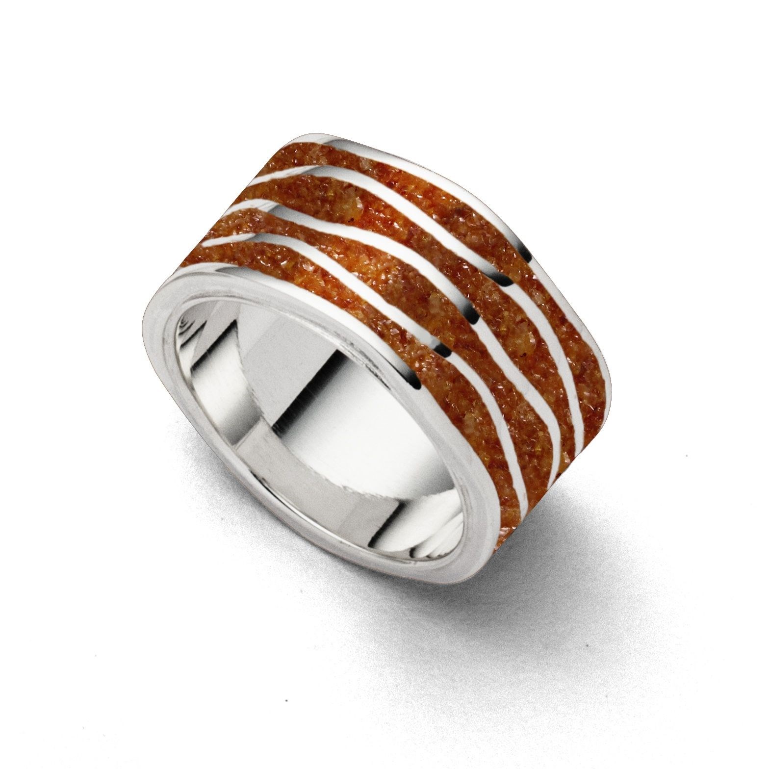 Breiter Bandring "Strandwellen", mit einem in Bernstein eingelegten Wellenmuster. Gefertigt aus rhodiniertem 925er Sterling-Silber. Durch die Rhodinierung ist das Schmuckstück anlaufgeschützt.