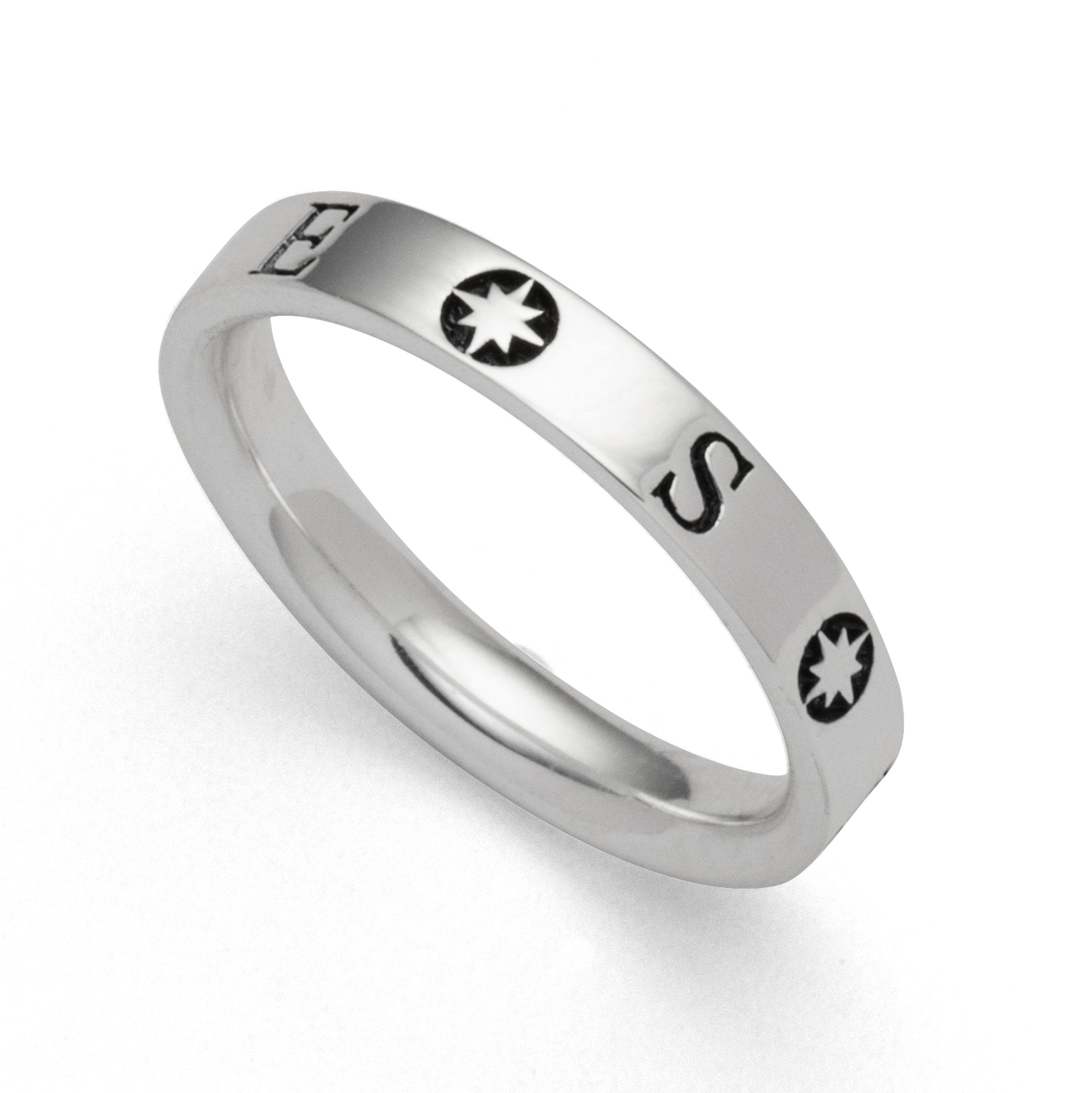Schmaler Vorsteckring "Kompass" mit den 4 Himmelsrichtungen und Kompassrose eingraviert und oxidiert im Wechsel , innen leicht bombiert aus 925er Sterlingsilber.