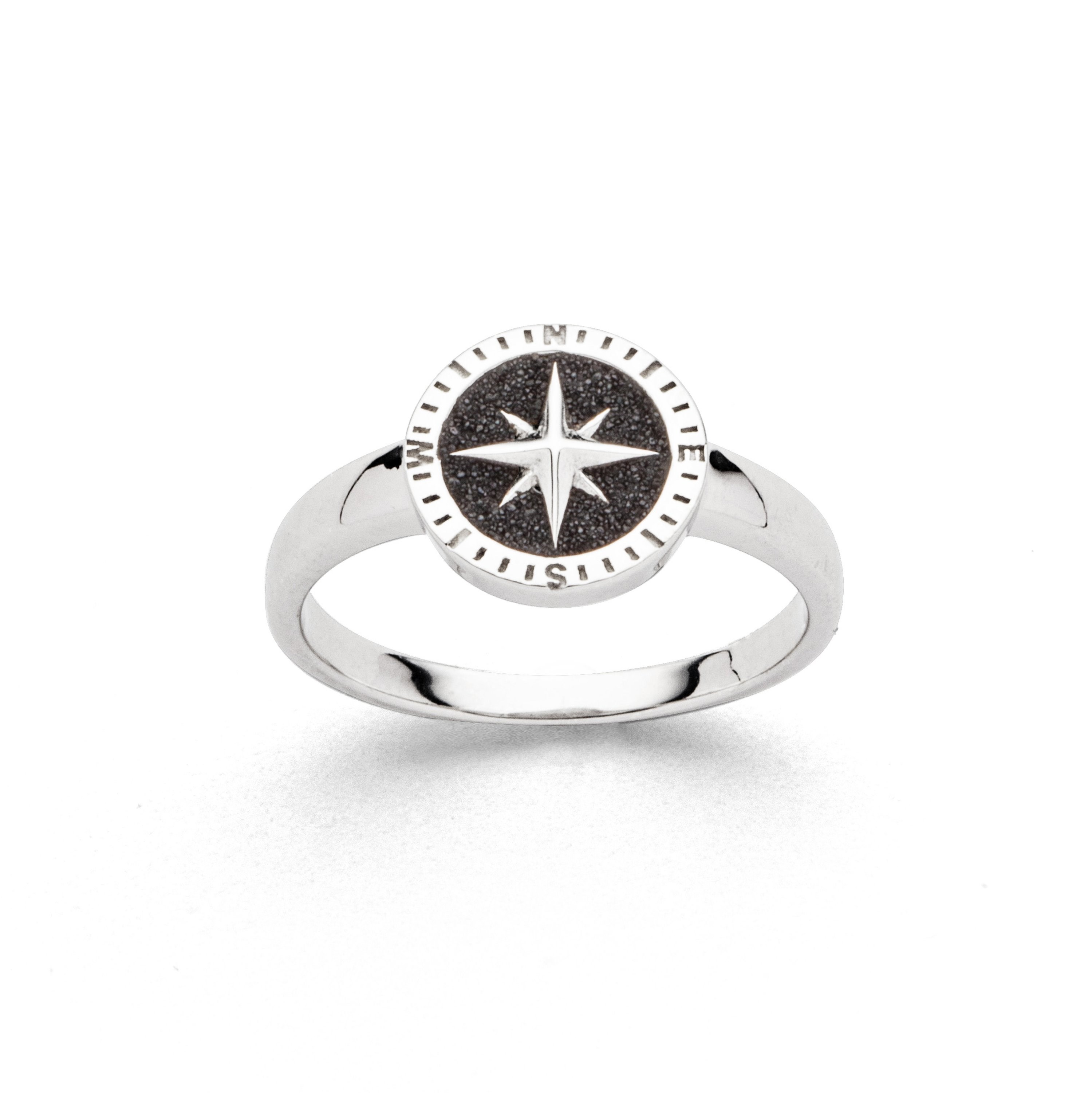 Runder Ring "Kompassrose 2.0" mit Lavasand gefüllt, aus poliertem, rhodiniertem 925er Sterling-Silber