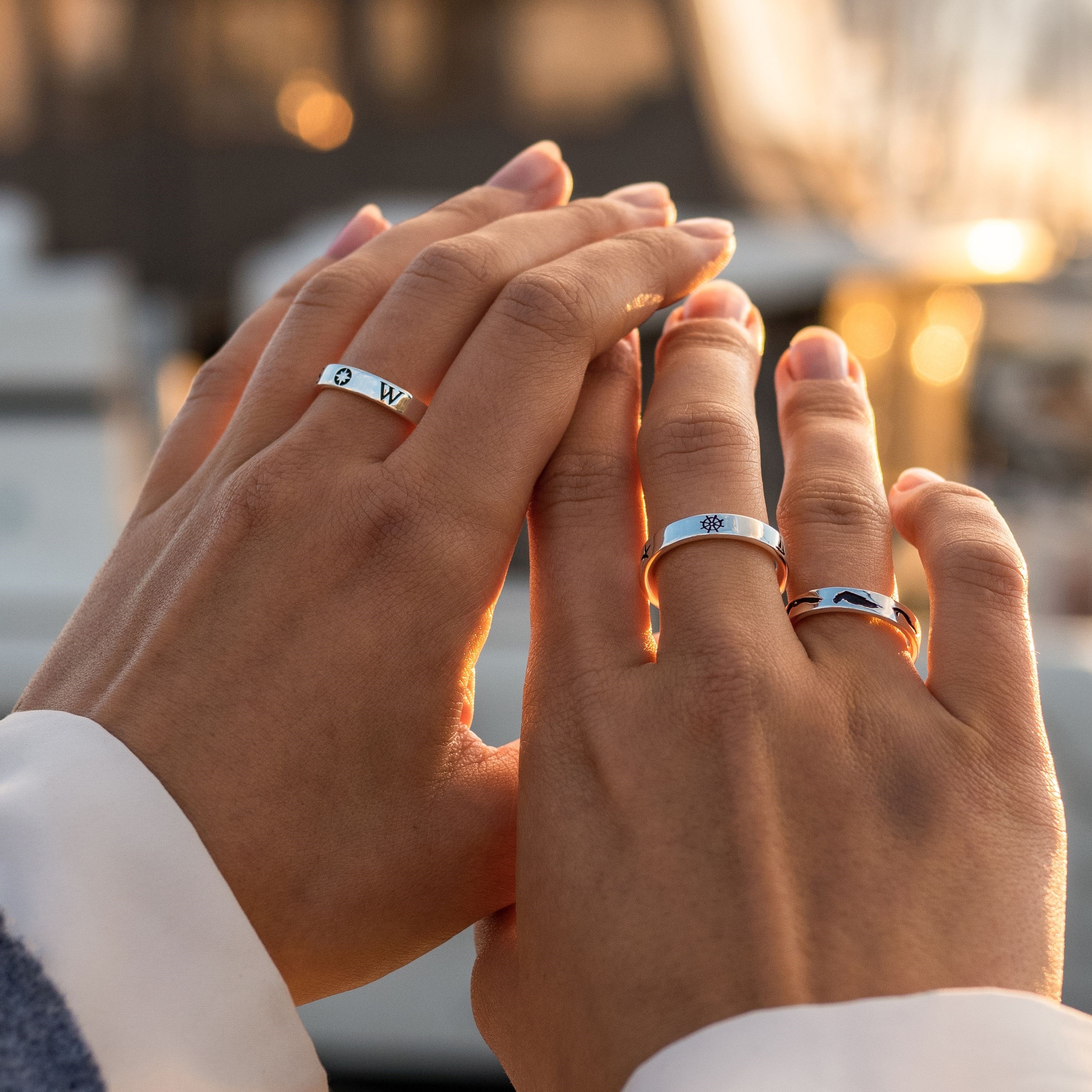Schmaler Vorsteckring "Maritim" mit 5 oxidierten, innen gravierten Motiven Möwe-Anker-Seestern-Steuerrad-Segelboot, innen leicht bombiert aus 925er Sterlingsilber.