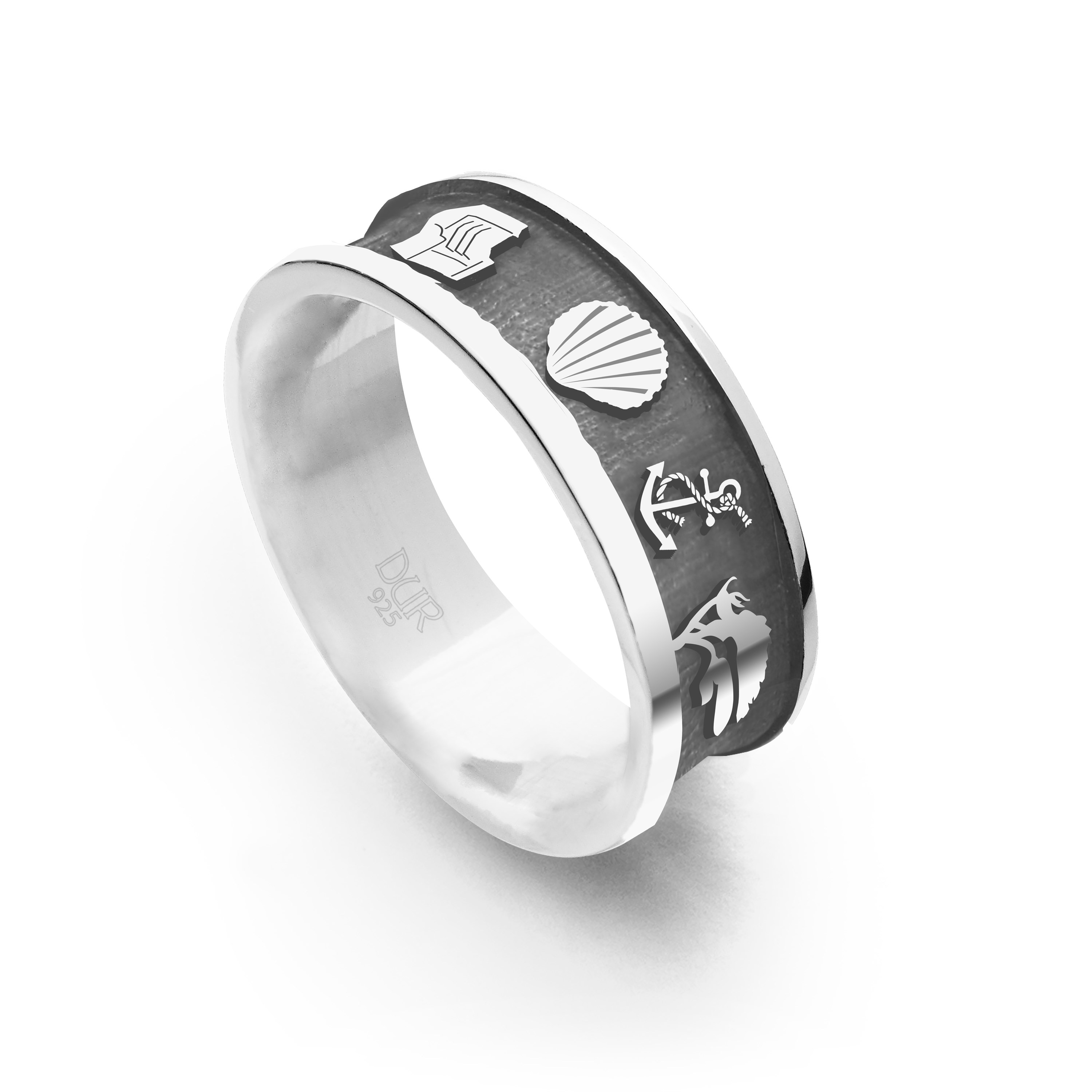 Bandring "Ostsee" 7 mm Premiumausführung mit den Motiven: Möwe - Leuchtturm - Strandkorb - Muschel - Anker - Windflüchter - Segelboot , innen dunkel rhodiniert, alles aus rhodiniertem 925er Sterling-Silber.