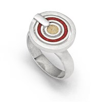 Ring "Roter Pirat klein", mit einem größeren gebürsteten Ring, einem mit Korallengranulat gefüllten mittleren Ring und einer kleinen runden mit Strandsand gefüllten Linse, die Ringschiene ist variabel zu verstellen, alles gefaßt in rhodinierten 925er Sterlingsilber.