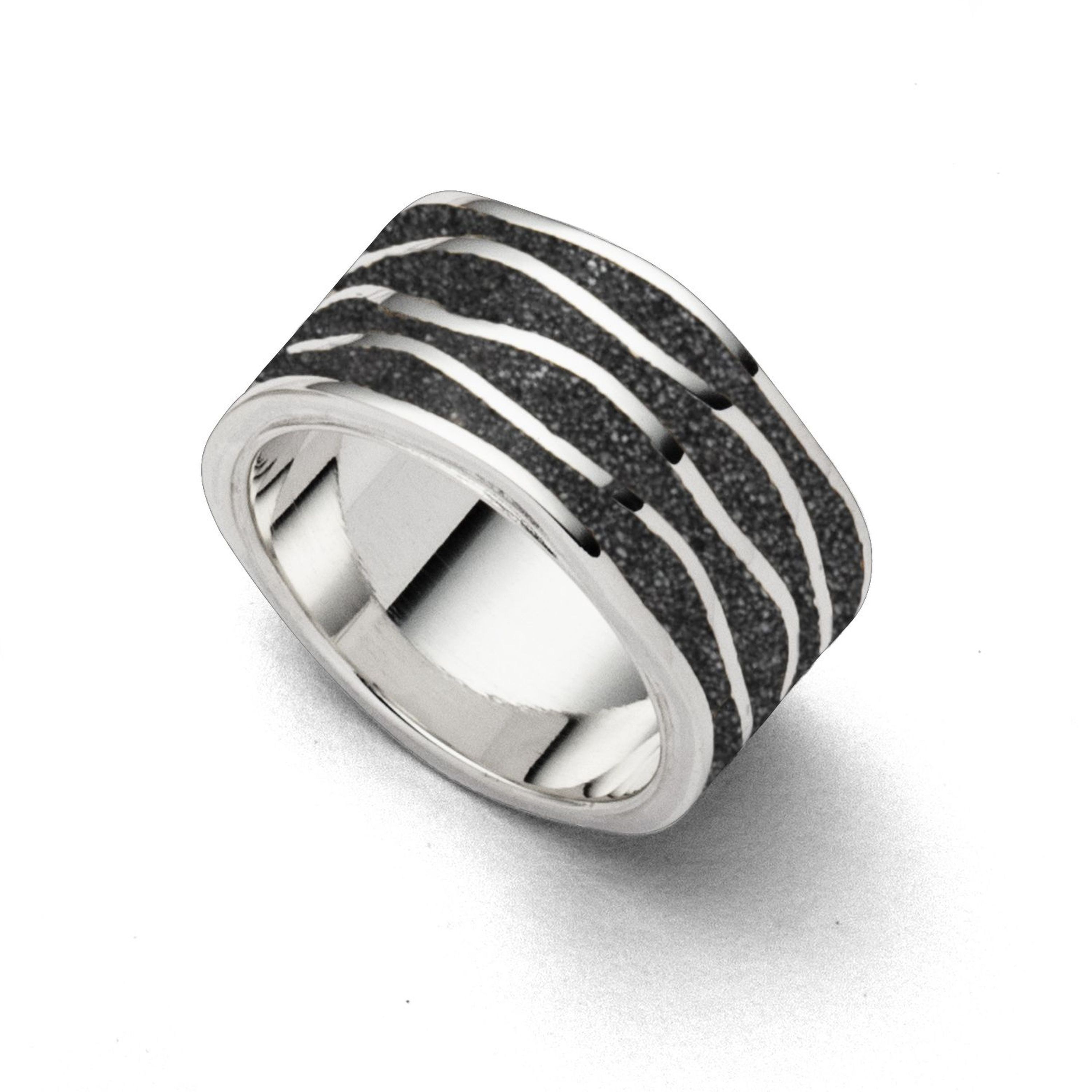 Breiter Bandring "Strandwellen", mit einem in Lavasand eingelegten Wellenmuster. Gefertigt aus poliertem und rhodiniertem 925er Sterling-Silber. Durch die Rhodinierung ist das Schmuckstück anlaufgeschützt.
