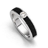 Ring "Venus" in Bandform, zur Hälfte gefüllt mit Lavasand und kombiniert mit einem 3,5 mm Zirkoniastein, der wie der hellste Planet am Himmel, die "Venus" erstrahlt. Alles angefertigt aus rhodiniertem 925er Sterling-Silber. Durch die Rhodinierung ist das Schmuckstück anlaufgeschützt.
