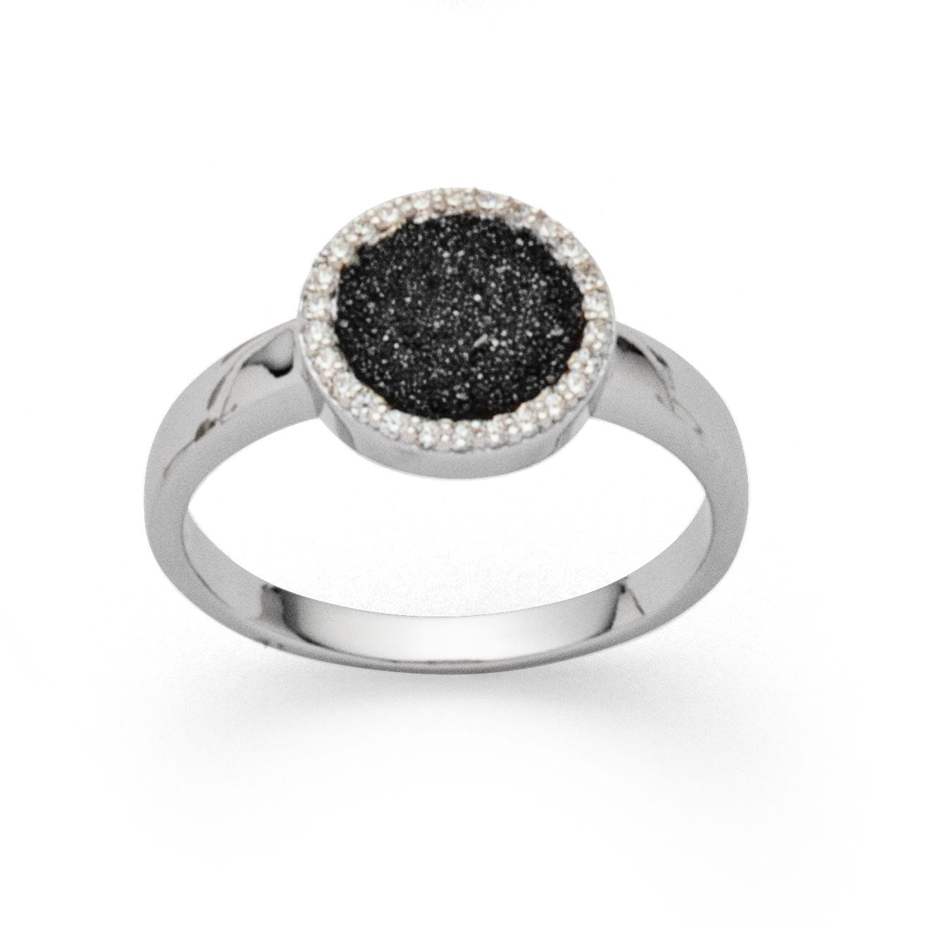 Runder Ring "Wasserflimmern" aus 925er Sterling-Silber, gefüllt mit Lavasand und umrahmt von 26 kleinen Zirkoniasteinen, die an das "Wasserflimmern" am Strand erinnern. Durch die Rhodinierung ist das Schmuckstück anlaufgeschützt.