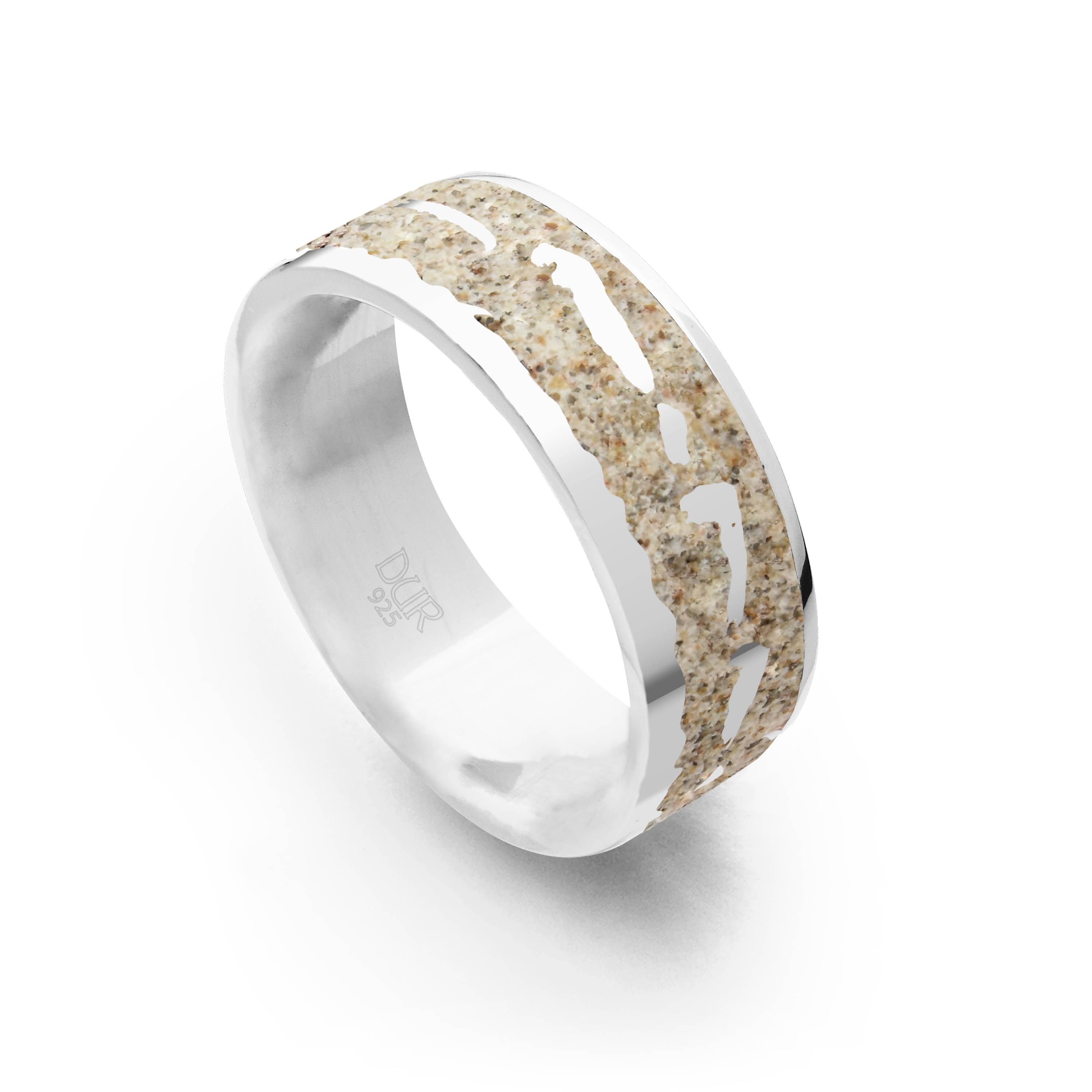 Strandring "Nordsee" 7 mm mit den Silhouetten der Nordseeinseln: Borkum, Juist, Norderney, Baltrum, Langeoog, Spiekeroog, Wangerooge, eingebettet in Strandsand und gefasst in rhodiniertem 925er Sterling-Silber.