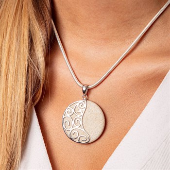 Runder, großer Strandsandanhänger "Sanddüne" mit einer filigranen, handgearbeiteten Verzierung aus poliertem und rhodiniertem 925er Sterling-Silber