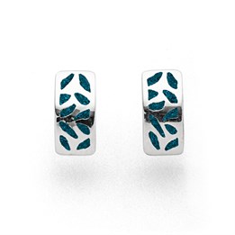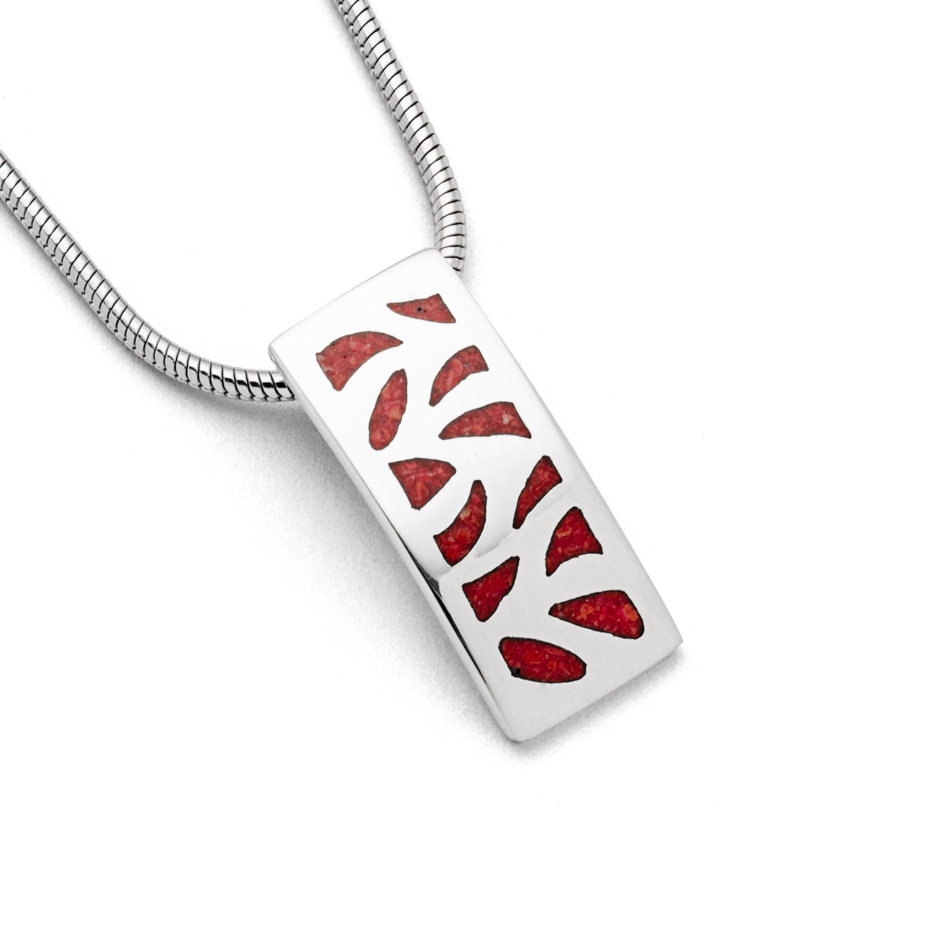 "Wandel" länglich, eckiger Anhänger, besetzt mit verspielten, geschwungenen, mosaik Koralle gefüllten Flächen, aus rhodiniertem 925er Sterlingsilber.