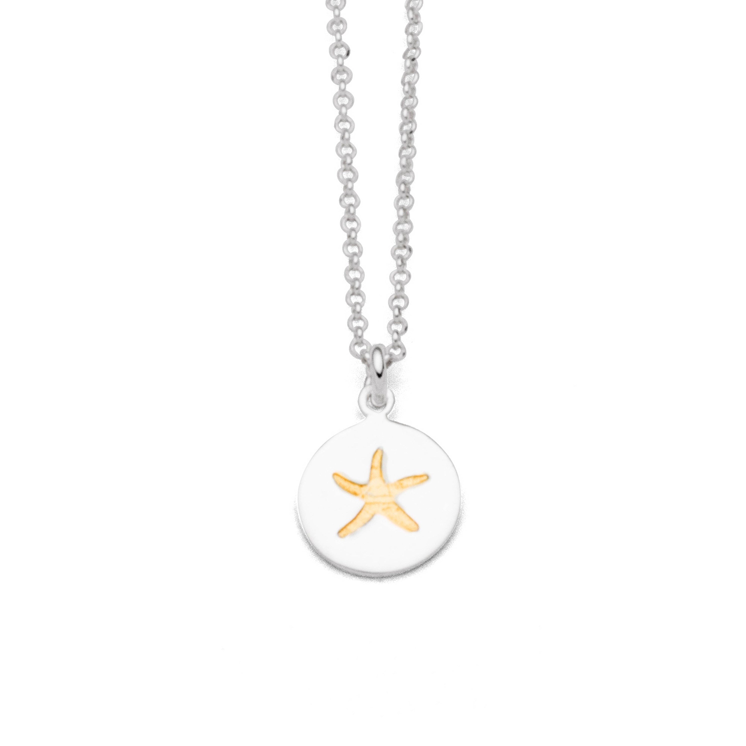 Kette "Traum", kleiner runder Anhänger mit eingelassenem, vergoldetem Seestern an einer ca. 42cm langen, feinen Erbskette, alles aus 925er Sterlingsilber.